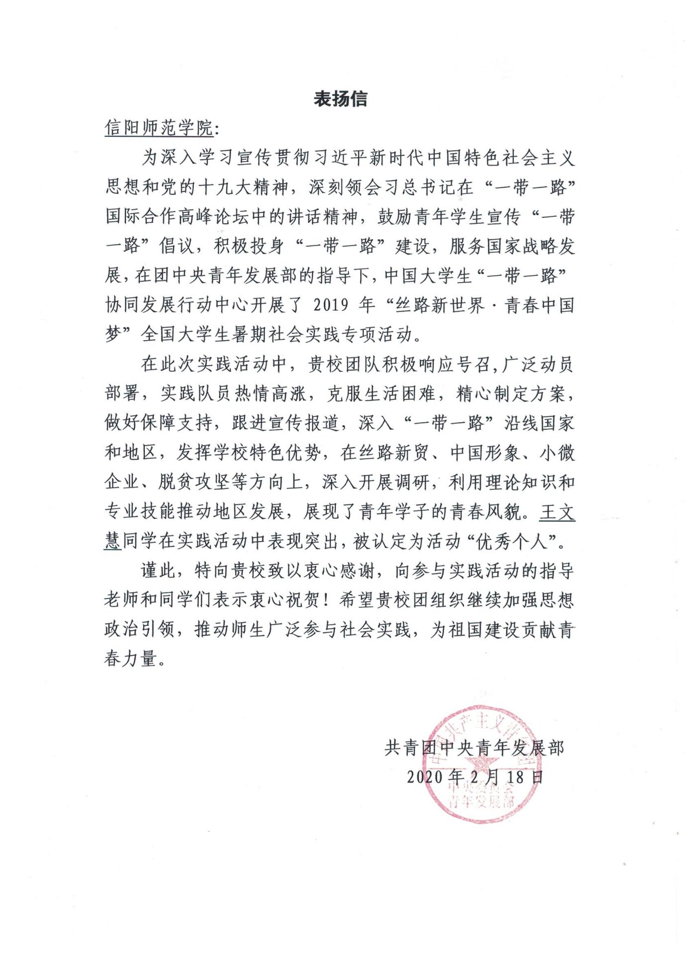 2020年9月21日,beat365亚洲版官网收到由共青团中央青年发展部发来的表扬信,信中提及beat365官网积极响应共青团中央的号召,参与由中国大学生“一带一路”协同发展行动中心开展的2019年“丝路新世界·青春中国梦”全国大学生暑期社会实践专项活动,团队队员热情高涨,充分展现beat365亚洲版官网学子的青春风貌。