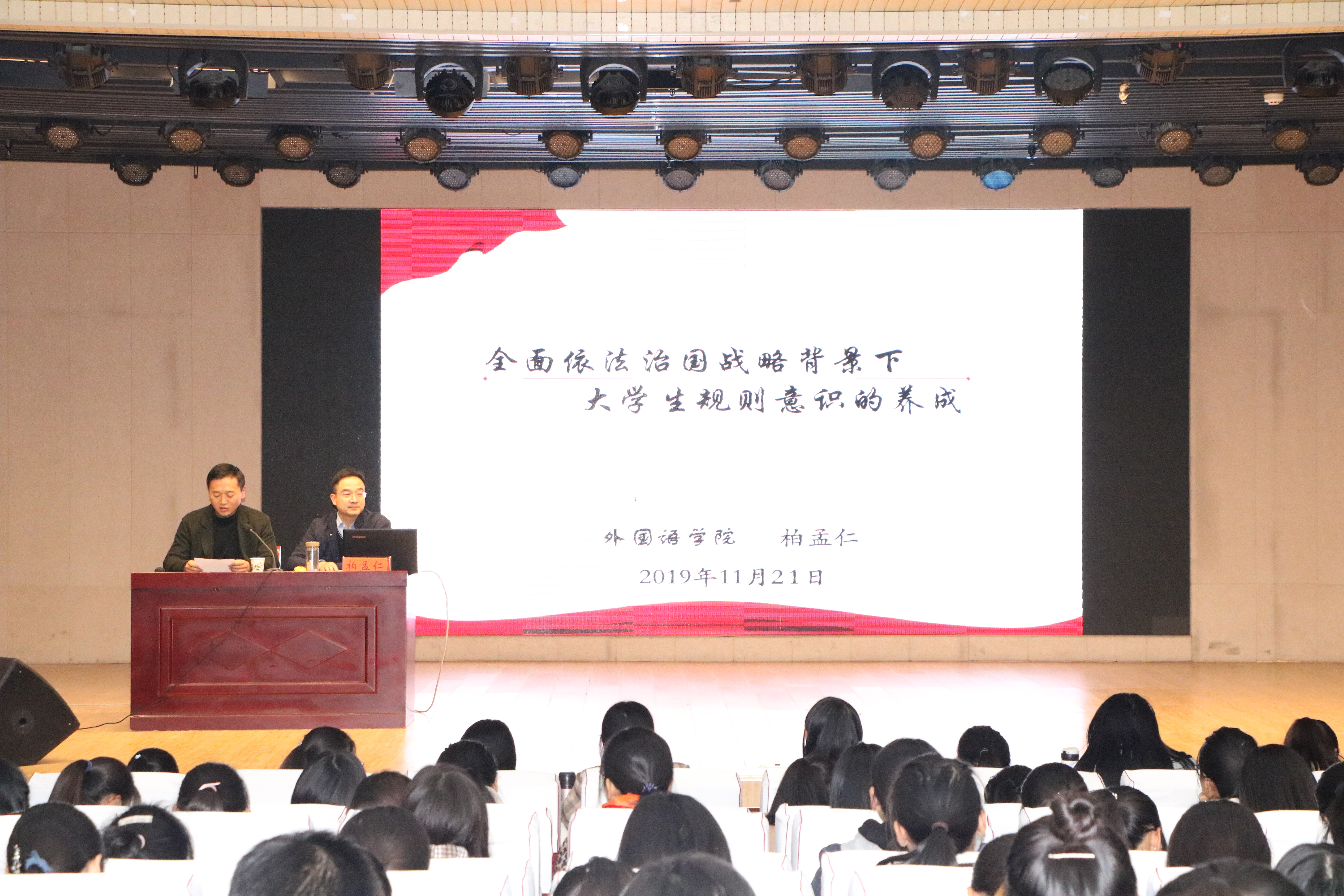 11月21日下午,外国语学院党委副书记柏孟仁在理科楼报告厅为beat365亚洲版官网和化学化工学院新生团员讲授题为“全面依法治国战略背景下大学生规则意识的养成”的主题团课。beat365亚洲版官网团委书记曹栋、化学化工学院团委老师赵方方及beat365亚洲版官网、化学化工学院全体新生团员共同聆听本次团课。