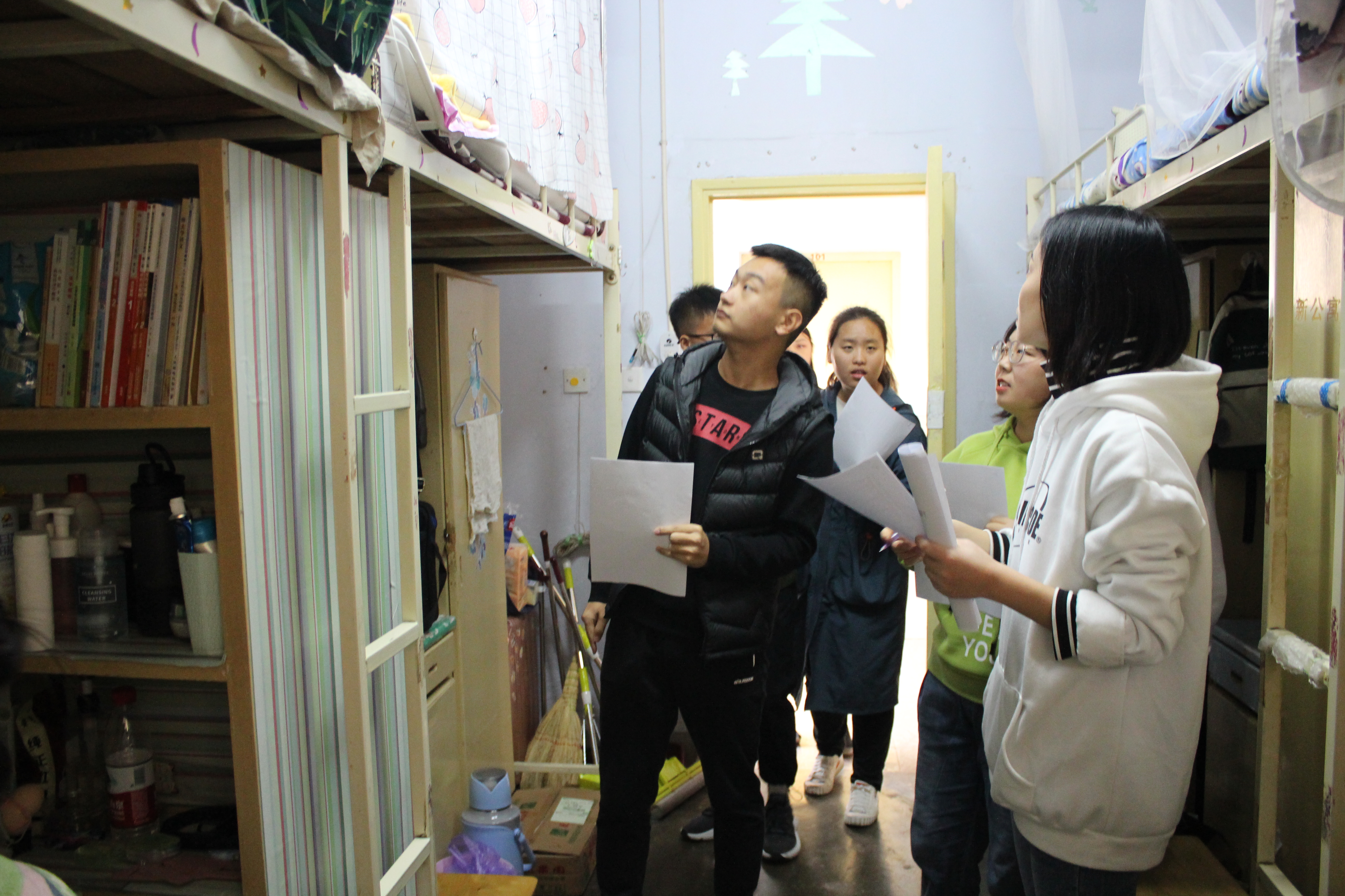首先,评比人员根据评比规则对各宿舍的绿色元素、宿舍文化、宿舍安全、宿舍内务等方面进行打分。宿舍代表向评比人员介绍宿舍内的绿色元素,展示本宿舍对废旧物品的利用创新和彰显宿舍文化底蕴的舍规舍训。随后,评比人员对各宿舍是否使用或存放违禁电器进行了详细检查,并提醒同学们严格遵守校规校纪,重视宿舍用电问题,提高安全防范意识,保障自身生命财产安全。在评选期间,劳卫部成员对同学们的日常生活情况进行询问,并对学生进行安全知识宣传。在学生积极配合下,评选顺利完成。