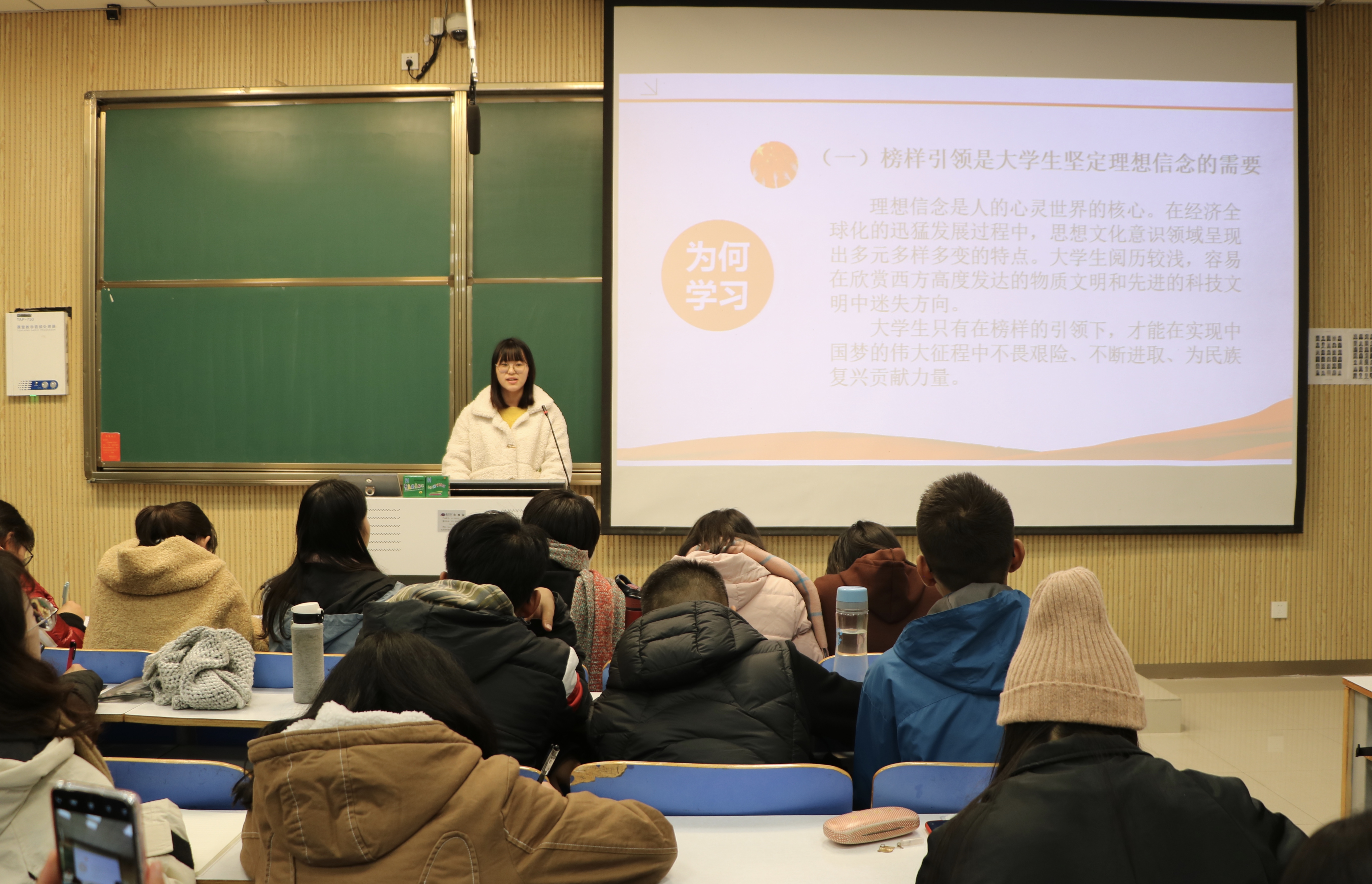 团课伊始,肖妍杰对青年马克思主义者培养工程进行简要介绍,并鼓励同学们积极加入。接着,高祎棣以“厚植爱国情怀,贡献青春力量”为题,围绕“爱国情怀从未褪色”、“爱国情怀源远流长”、“爱国主义和个人价值”、“以青春之我谱写爱国华章”四个部分展开详细讲述。她结合普通百姓、英雄人物的事例,向同学们展示了中国人民和中华民族浓厚炽热的爱国情怀,希望同学们不忘初心,牢记使命,胸怀祖国,艰苦奋斗。随后,张晓艳进行题为“聚焦先进榜样,放飞青春梦想”的宣讲,她从“讲故事”、“学理论”、“做思考”三方面向大家具体说明榜样的定义和榜样的力量,鼓励同学们以身边先进模范为榜样,提高自己思想道德修养,以实际行动彰显新时代学子风采。最后,肖妍杰对同学们的团课感悟进行交流,并对本次团课进行总结。