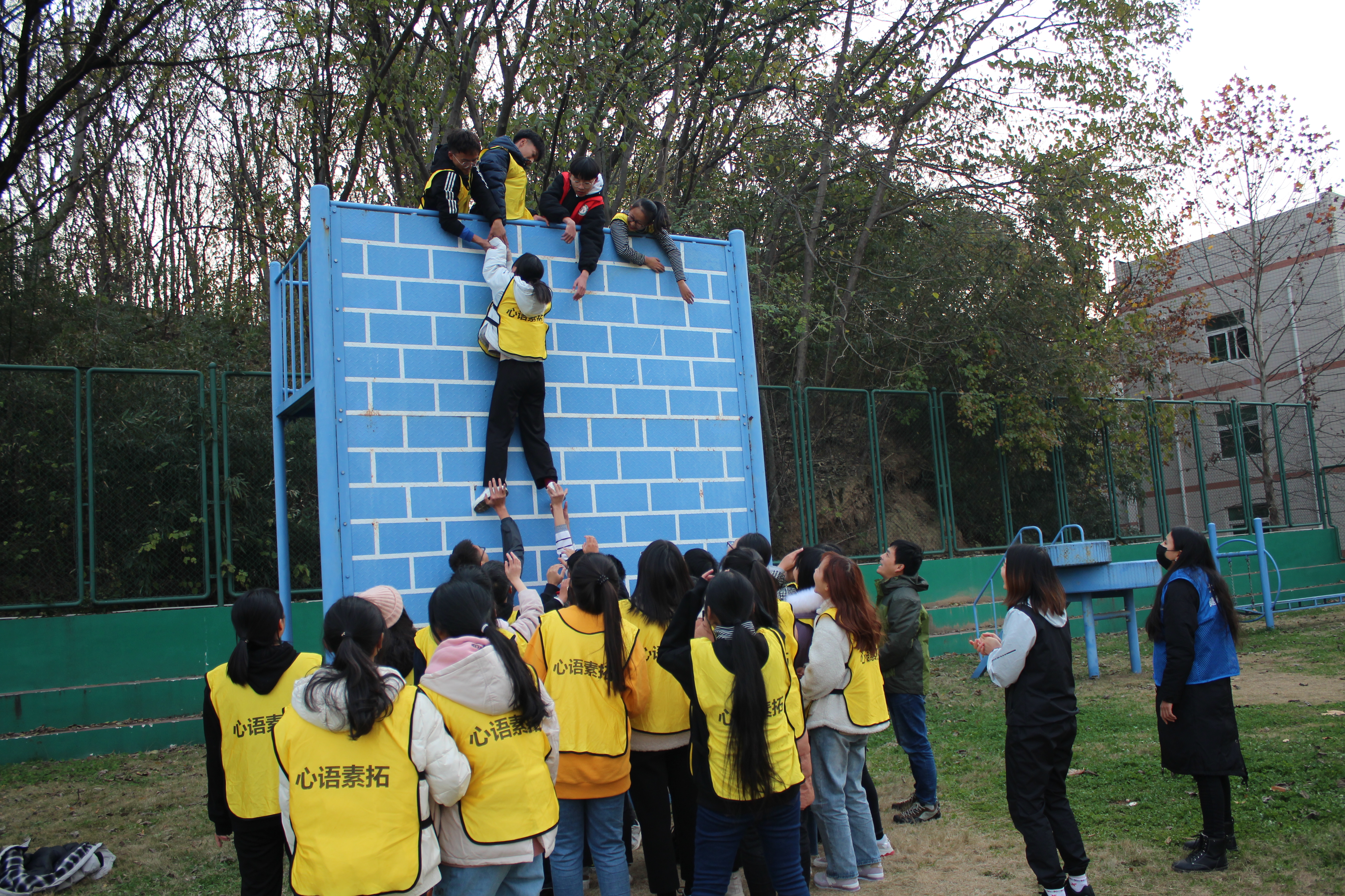 本次素质拓展活动把学生划分为两个小组,围绕着高空断桥、紧急逃生墙等活动项目有序开展。教练员组织学生进行热身游戏,易于学生更加顺利完成游戏。在高空断桥项目中,同学们不断突破自我心理障碍,伴随着团队伙伴的鼓励话语,勇敢跨过高空隔板,完成对自我的挑战;在珠行万里项目中,同学们发扬团结协作的精神,彼此默契配合,最终互相搀扶实现珠行万里;在紧急逃生墙项目中,同学们克服内心恐惧,不断加深彼此信任关系,依靠高空托举完成对逃生墙的翻跃,展现了极强的团队协作能力。随后进行的“松鼠搬家”、“环环相扣”等游戏将现场气氛推向高潮。同学们团结协作,默契配合,圆满地完成本次素质拓展活动。活动最后,陶青青与活动成员对教练员的悉心指导致以感谢,并着重强调通过本次活动,同学们更能深刻体会团队精神的真正内涵,提高了自身心理素质。