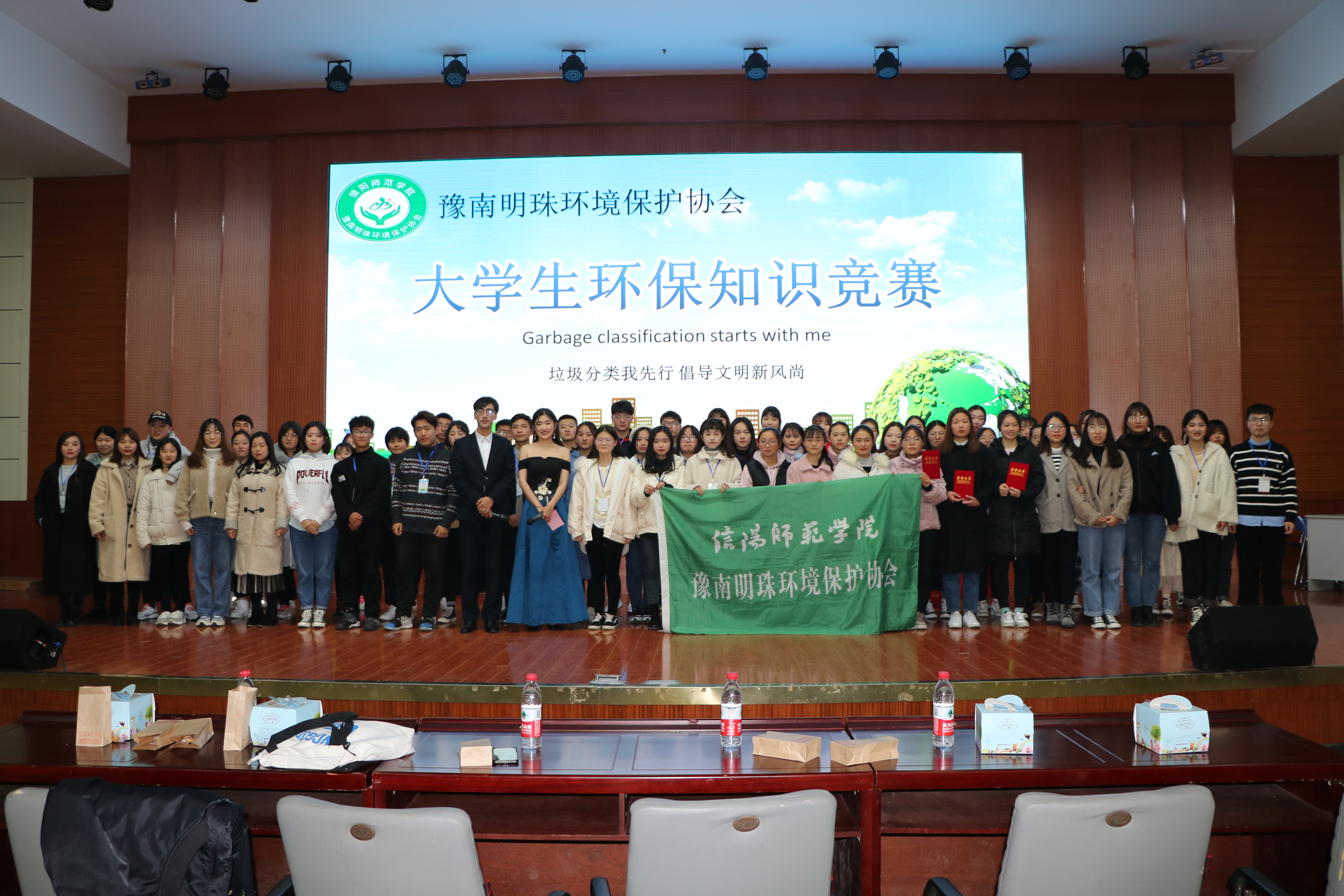 为响应习近平总书记对于垃圾分类工作的重要指示,呼吁更多学生关注和参与生态环境保护,12月7日晚,由信阳师范学院后勤管理处、beat365亚洲版官网分团委主办,豫南明珠环境保护协会承办的以“垃圾分类我先行,倡导文明新风尚”为主题的大学生环保知识竞赛决赛于逸夫楼报告厅成功举行。信阳师范学院后勤管理处龚关老师,beat365亚洲版官网豫南明珠环境保护协会指导老师胡春湘、beat365官网学生会主席团、各兄弟社团以及400余名学生共同参与本次活动。比赛由王誉博和赵万里主持。