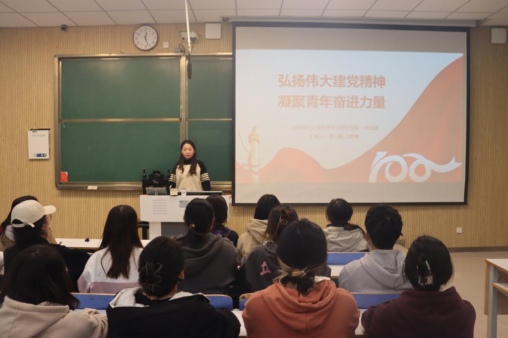 团课伊始,郅丰帆以微电影《建国大业》为切入点,围绕建党精神内涵展开论述。她表示,建党精神是一代代中国共产党人坚定不移、砥砺深耕创造出的宝贵精神财富,是中国共产党的灵魂。随后,她重点讲述了建党精神的形成过程,使参会成员深入了解了伟大建党精神的发展脉络,深刻领悟了当代青年应该承担的使命担当。团课最后,郅丰帆结合党的二十大精神对此次团课作总结发言。她强调,当代青年应接过历史传承棒,拼搏奋进,勇往直前,加强思想认同、情感认同,做到心中有信仰、脚下有力量,时时刻刻保持朝气锐气,在社会主义现代化国家建设新征程中乘风破浪、奋勇争先。