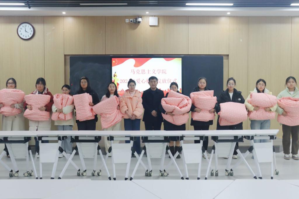 仪式伊始,高小佳代表学院向同学们表达慰问与关心。她嘱咐同学们保重身体、注意防寒保暖,鼓励受资助同学自立自强、早日成才。发放仪式中,领导老师们亲手为同学们分发棉被,这一幕温馨而感人,不仅传递着物质上的温暖,更将关爱与期望深深植入每位学生的心田。最后,王超表示,学院会尽最大的努力去解决同学们的实际困难,营造良好的学习和生活环境。他勉励同学们要志存高远,崇尚美德,将社会主义核心价值观内化于心、外化于行,做知恩报恩、传递温暖、提高本领的践行者;做砥砺前行、迎难而上、奋斗不息的奋进者。发放仪式结束后,领导老师们与受资助学生进行合影留念。此次爱心棉被发放活动,不只为同学们带来了实实在在的帮助,更为贫困学生构筑了坚实的后盾,让他们不再有后顾之忧。