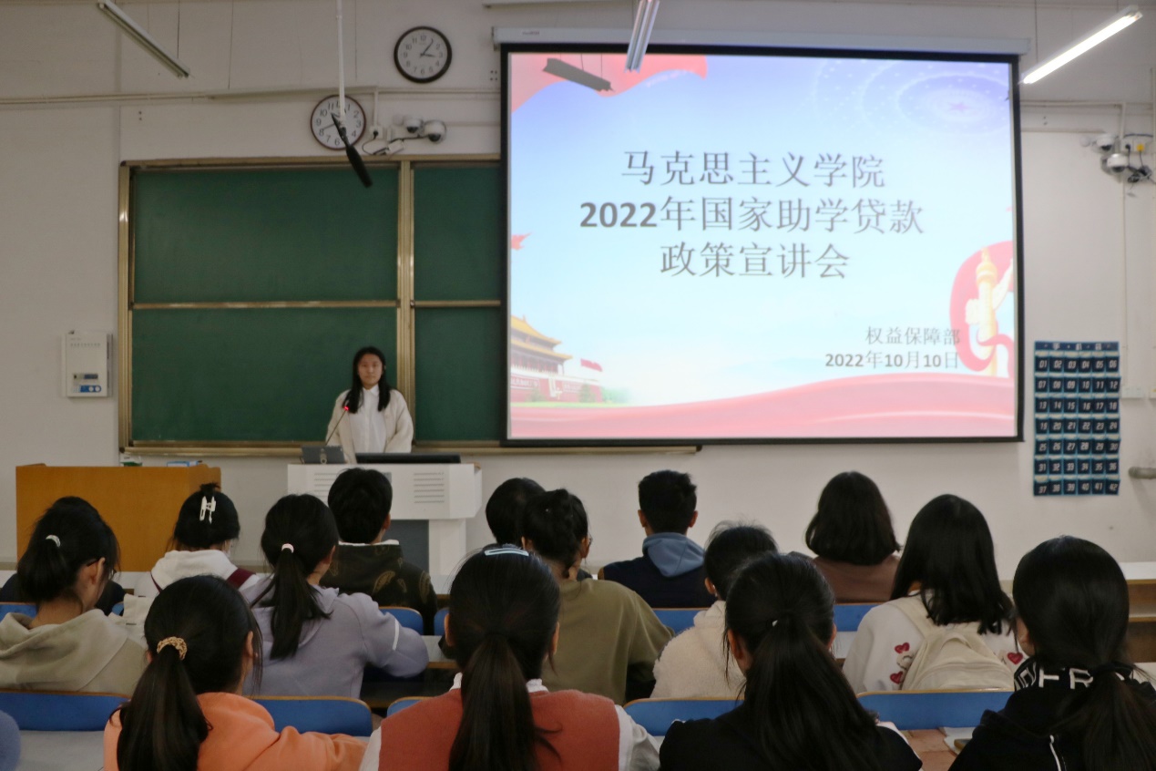 会上,孔心翼向大家介绍了国家助学贷款的相关政策,包括助学贷款的资助对象、资助标准、申请方法、发放方式等方面。她展示了登录学生在线服务系统申请国家助学贷款的具体步骤,并提醒相关注意事项。接着,学生们浏览了国家开发银行高校助学贷款宣传具体步骤,进一步了解了国家助学贷款的政策。最后,权益保障部对申请助学贷款的条件、贷款年限作了相关补充,并提醒学生们要强化责任意识和契约观念,按期还款还息。