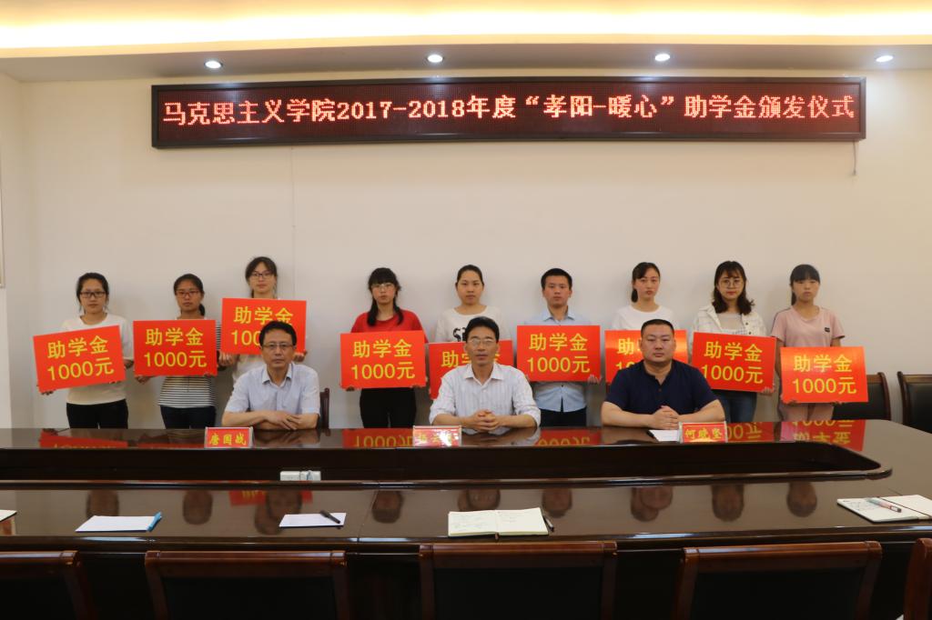 为帮助家庭经济困难学生顺利完成学业,激励他们努力进取、勤奋学习,5月29日下午,beat365官网在社科楼323会议室举行beat365亚洲版官网2017—2018年度“孝阳―暖心”助学金颁发仪式。beat365官网院长杨云善、党委书记唐国战、党委副书记何晓坚、团委老师曹菁菁与本次25名受助学生共同参加。仪式由何晓坚主持。