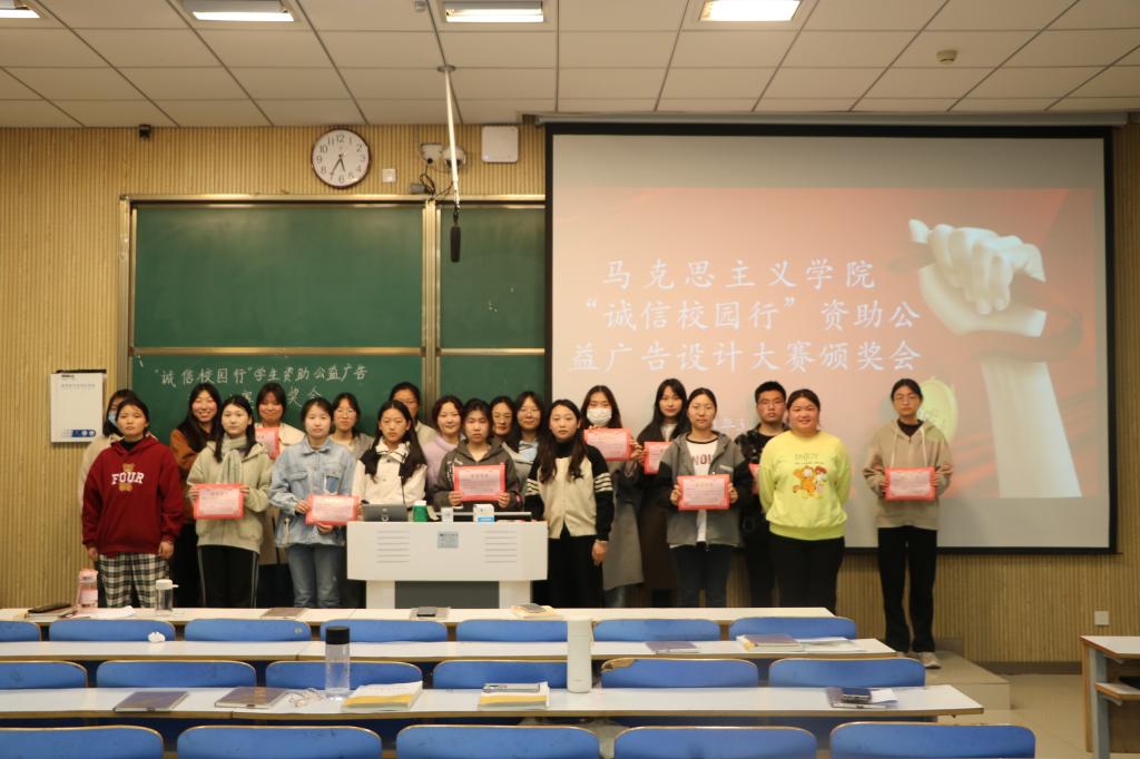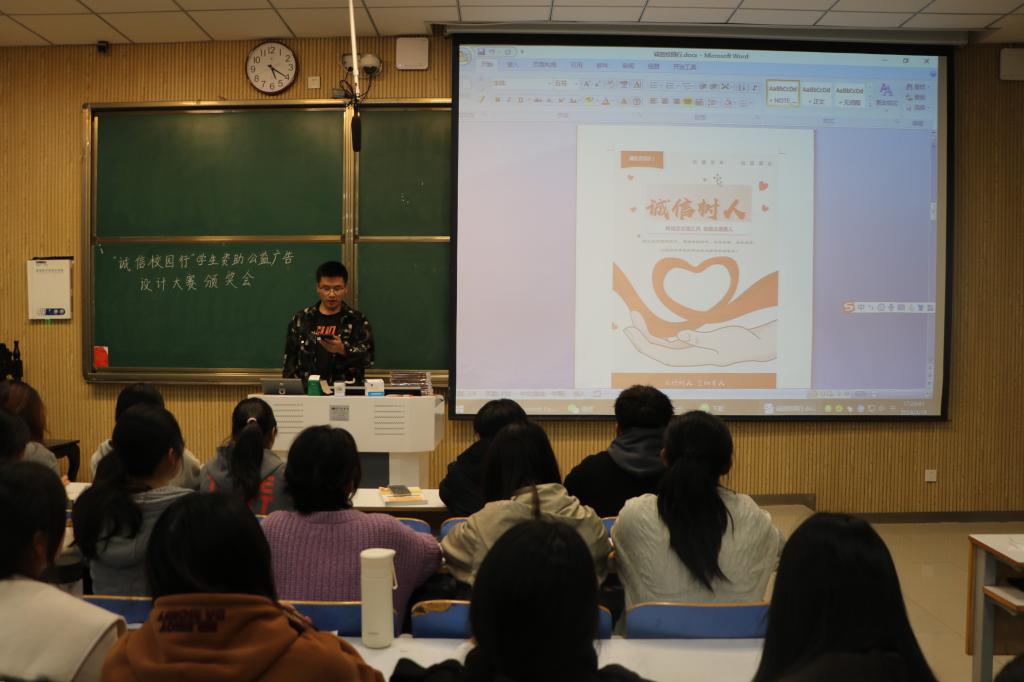 会议伊始,郅丰帆介绍了本次活动的意义和宗旨并向参会人员展示了获奖作品。其中平面类一等奖《树诚信自强风,做励志感恩人》的作者赵晨阳通过艺术性卡通设计的方式传递党和政府教育资助政策的温度,同时呼吁同学们敢于申请资助,自立自强,树立正确的价值观,适应新时代的发展,做德才兼备的青年。短视频类二等奖《资助予心,感恩于行》的作者张嘉芮和谢佳邑采用由面及点、由浅到深的拍摄构思,以校园取景讲述个人励志奋斗的故事,打破了公众对贫困资助固有印象,展现了新时代青年自强奋进、责任担当、诚信感恩的品质。整个公益广告设计大赛的过程也是参赛者不断体悟诚信的内涵过程,有助于增强大学生的责任感,呼吁同学们从小事做起,诚信做人,诚信做事。最后,活动负责人为获奖者颁发证书和奖品并合影留念。