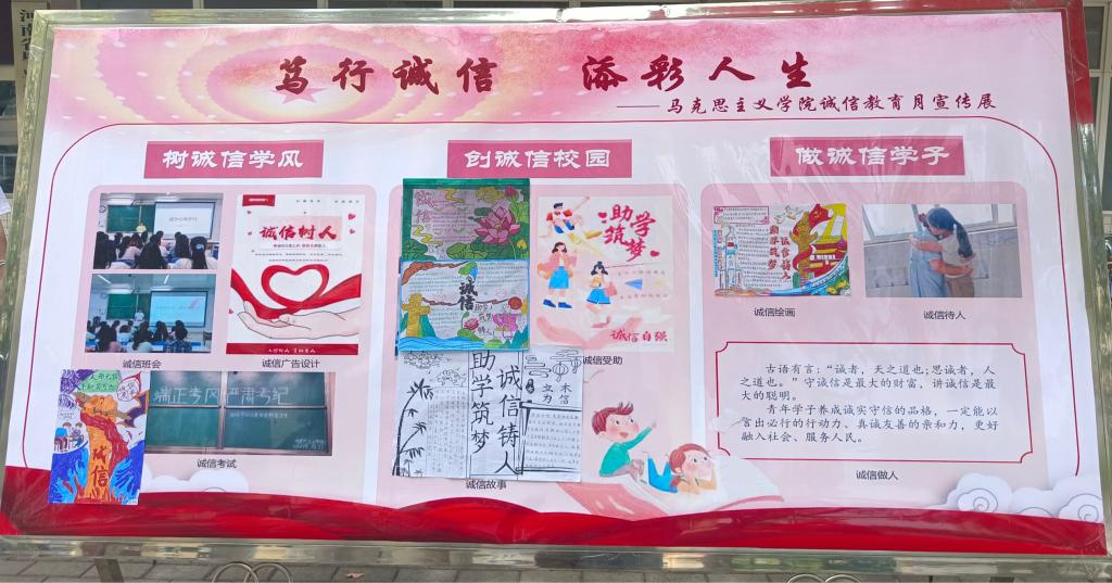 本次比赛主要是以绘画艺术的形式,进行诚信教育宣传。比赛前期,通过推文、QQ等多种形式的活动预告宣传,beat365官网青年学子踊跃报名并认真准备手抄报的制作。比赛期间,参赛者们围绕诚信宣传的主题,采用绝妙的色彩搭配 ,以独特的创作视角 、新颖的思维观点共同呈现出了完美的手抄报作品,为我们展现了诚信的重要性和必要性。比赛结束后,参赛同学的作品在beat365亚洲版官网诚信教育宣传展报上进行了展示。