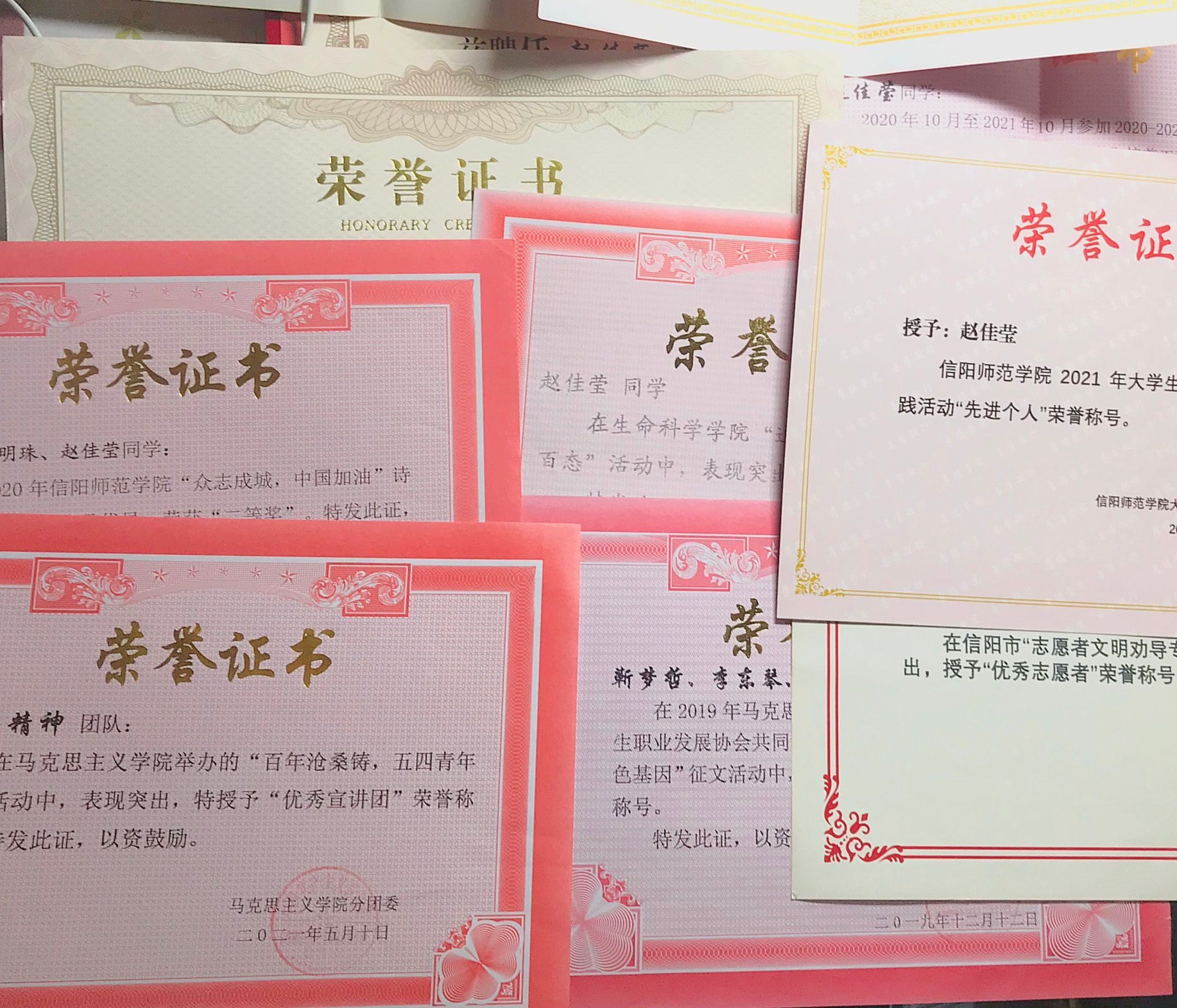 在学院学生会工作中,认真做好部门负责人一职,协助就业指导老师为学院毕业生服务。一年以来,一直秉承“踏实严谨、不断进取”的理念,提升自身工作能力,完成学院的各项就业工作,举办多场就业双选会,为beat365官网毕业生服务,曾荣获信阳师范学院学生会述职评议工作“优秀个人”称号。在班级中,认真做好寝室长一职,热心帮助、团结同学,协助班委开展日常工作,推动班级工作顺利开展。