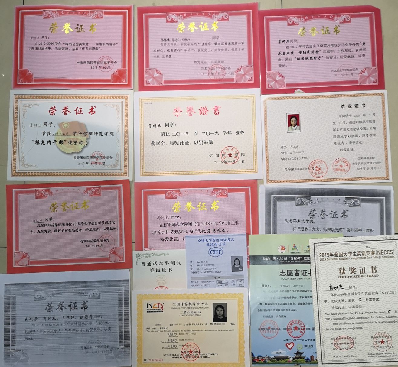 该生勤学善思,刻苦学习。在担任学生干部期间,对自己提出更高的学习要求,取得较好成绩:大一综合测评第5名,学习成绩第5名,获得校级一等奖学金。大二综合测评第1名,学习成绩第9名,获得国家励志奖学金;2018年12月,获得普通话水平测试二级甲等的成绩。2019年3月,顺利通过全国计算机等级二级MS OFFICE应用考试。2019年12月,通过英语四级。2019年6月,获得全国大学生英语竞赛C类三等奖。2019年8月,通过英语六级。