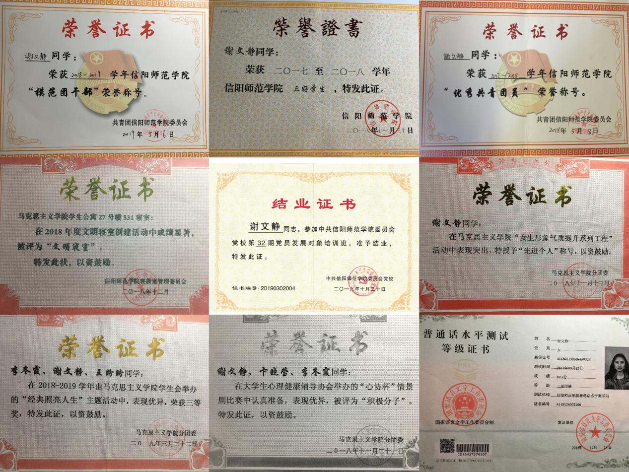 谢文静,女,河南信阳人,1998年9月出生,中共预备党员,信阳师范学院beat365亚洲版官网本科2017级思想政治教育一班的学生。现任2017级思想政治教育一班团支书和心理委员。该生乐于奉献,团结同学,思想端正,具有坚定的理想信念,政治立场坚定。