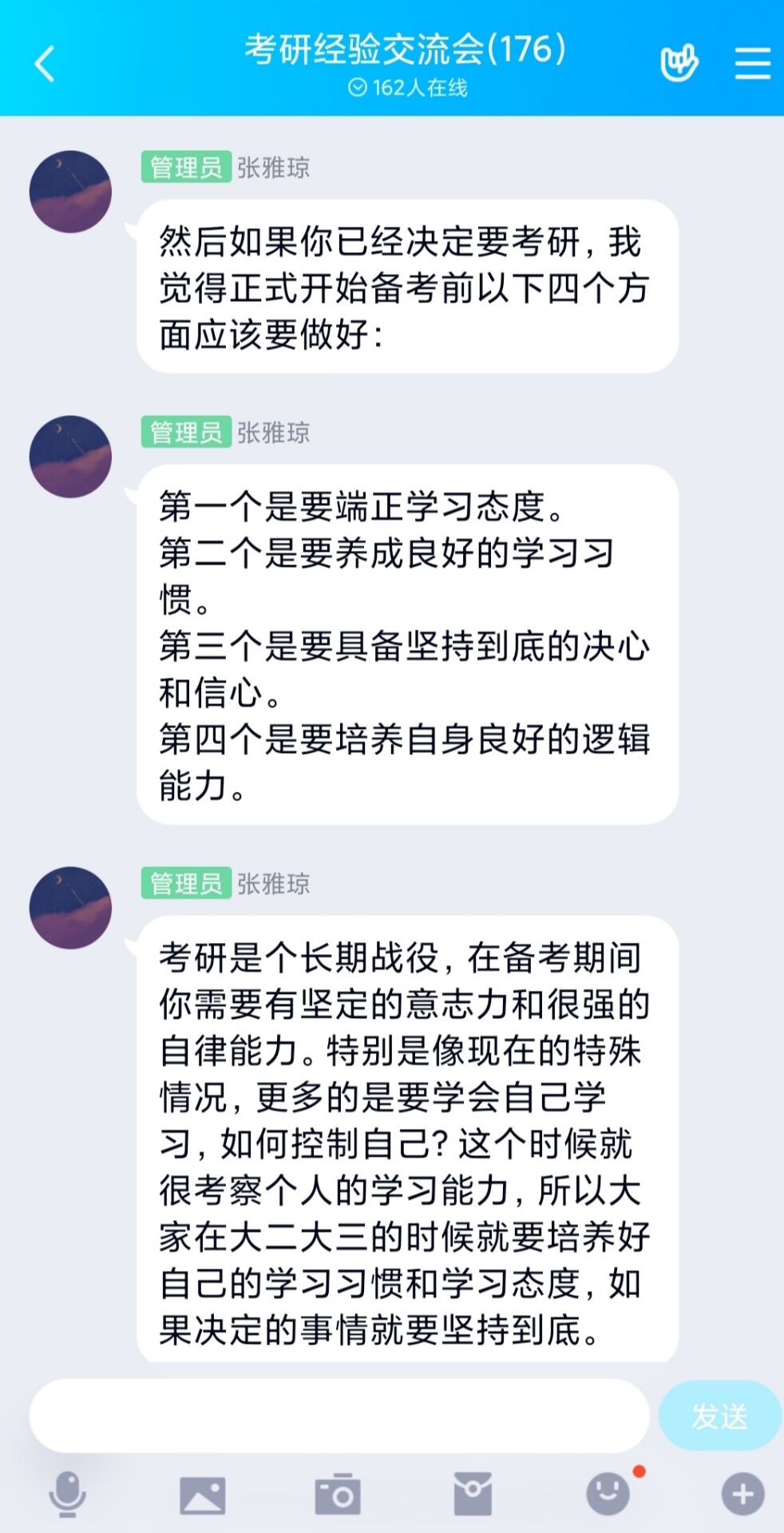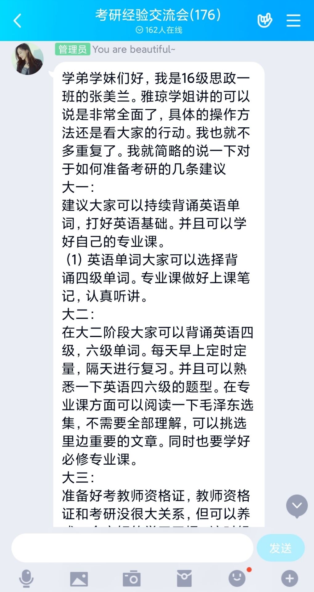 6月11日下午,beat365亚洲版官网考研服务社通过腾讯QQ线上平台举办了“以梦为笔,绘美研途”主题考研经验交流会。beat365官网2016级优秀考研学生代表张雅琼、张美兰以及2018、2019级有意向考研的同学共同参加本次交流会。会议由考研服务社牛笑怡主持。