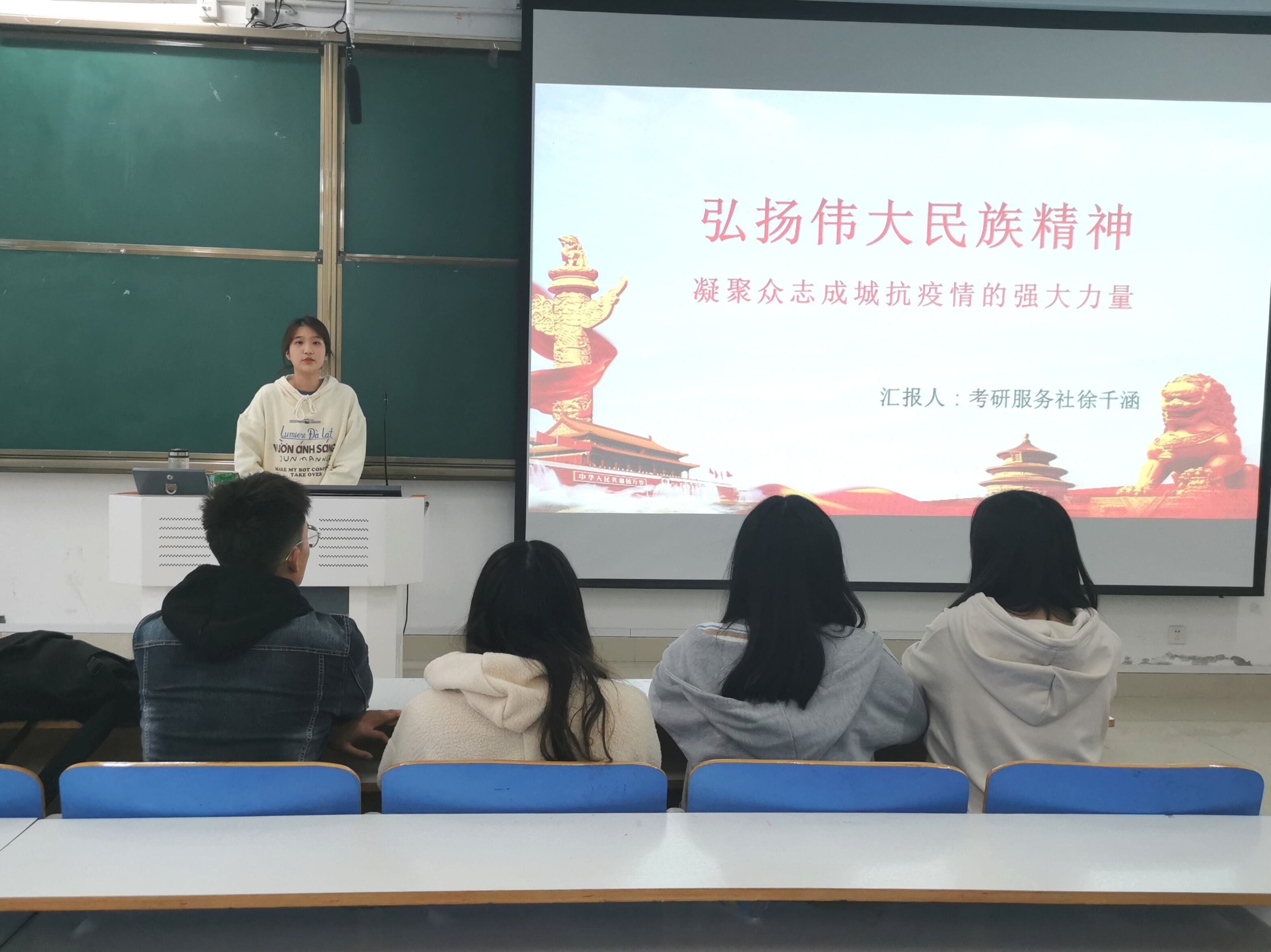 为进一步加深社团成员对民族精神的深刻理解,提高对民族精神的认同感。考研服务社于10月14日上午,考研服务社在社科楼516教室开展“弘扬伟大民族精神”主题团课,此次团课由团支书徐千涵主持。