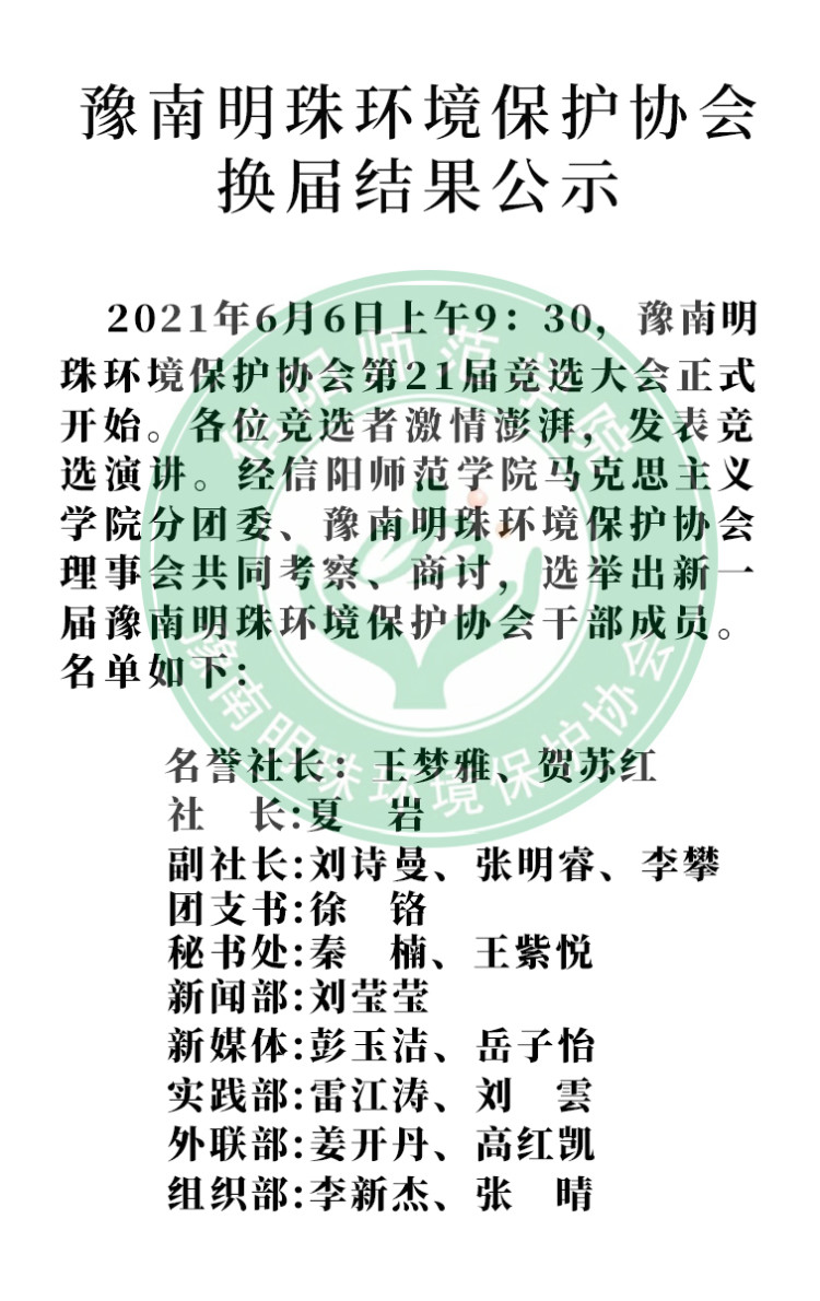 6月6日上午,豫南明珠环境保护协会换届竞选大会在社科楼514顺利举行。beat365亚洲版官网分团委社团分管主席、社团会长、团支书、各部部长及20级社团成员共同参加了此次会议。会议由会长王梦雅主持。