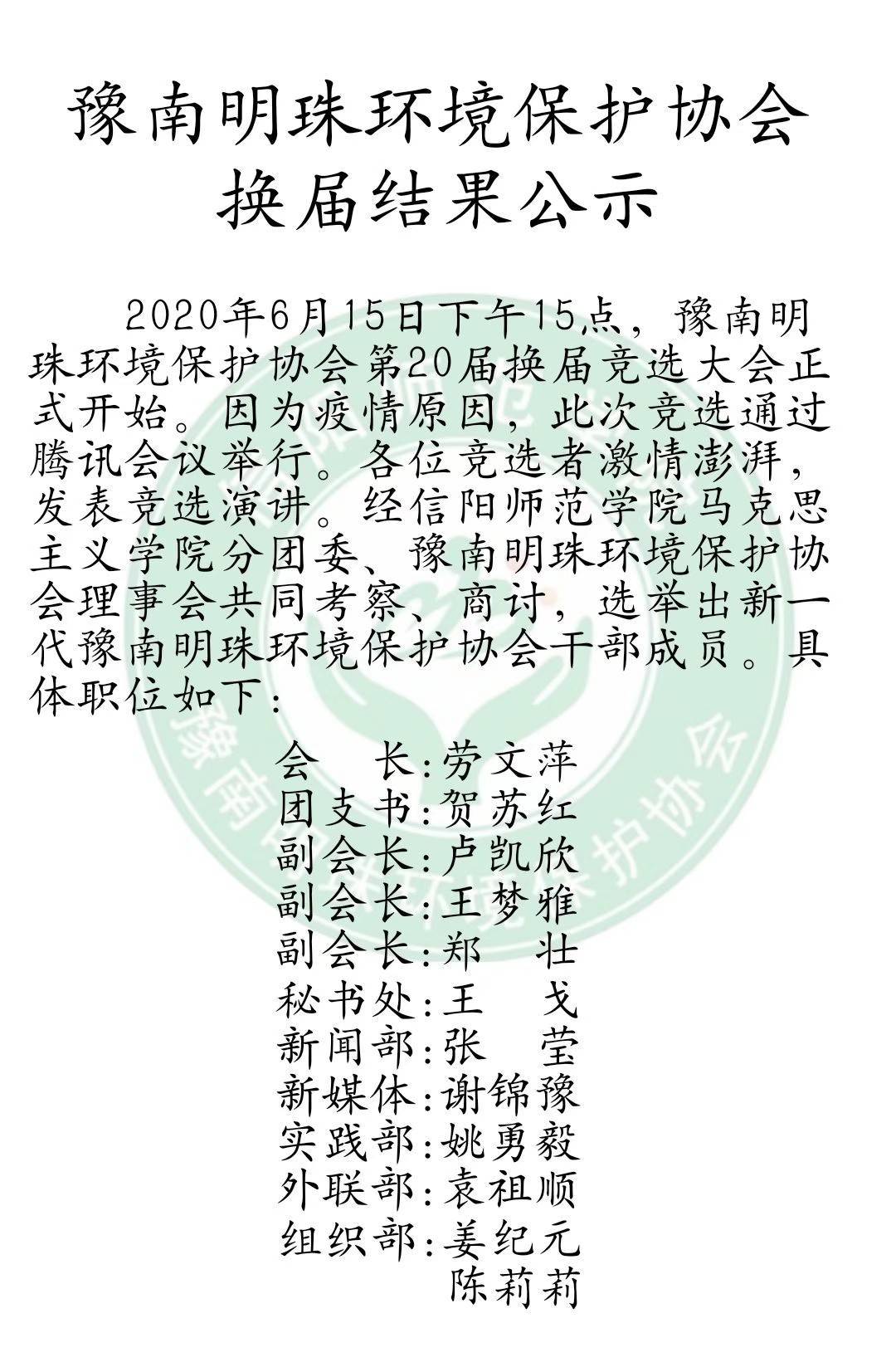 6月15日下午,豫南明珠环境保护协会换届竞选大会在线上会议平台腾讯会议顺利举行。beat365亚洲版官网分团委社团分管主席、社团会长、团支书、各部部长及19级社团成员共同参加了此次会议。会议由会长吕苗苗主持。