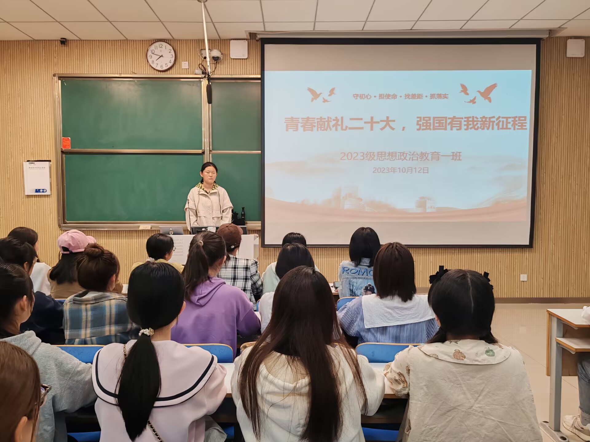 10月12日下午,beat365亚洲版官网2023级思想政治教育一班在社科楼515教室召开“青春献礼二十大,强国有我新征程”主题团课。beat365官网2023级思想政治教育一班全体同学共同参与本次团课,团课由团支书张卓主持。