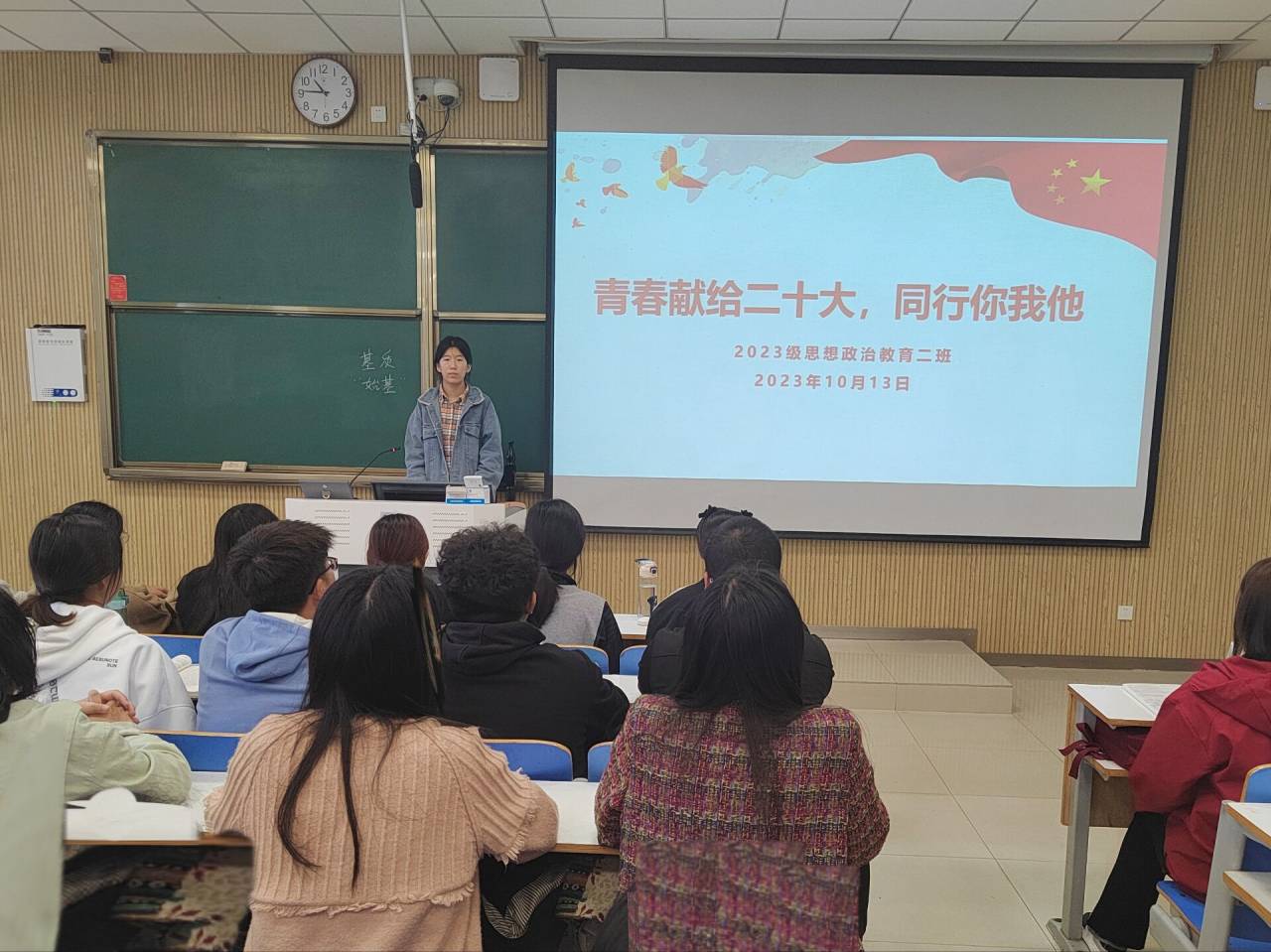 10月13日上午,beat365亚洲版官网2023级思想政治教育二班在社科楼515教室召开“青春献给二十大,同行你我他”主题团课。beat365官网2023级思想政治教育二班全体同学共同参与本次团课,团课由团支书王慜初主持。