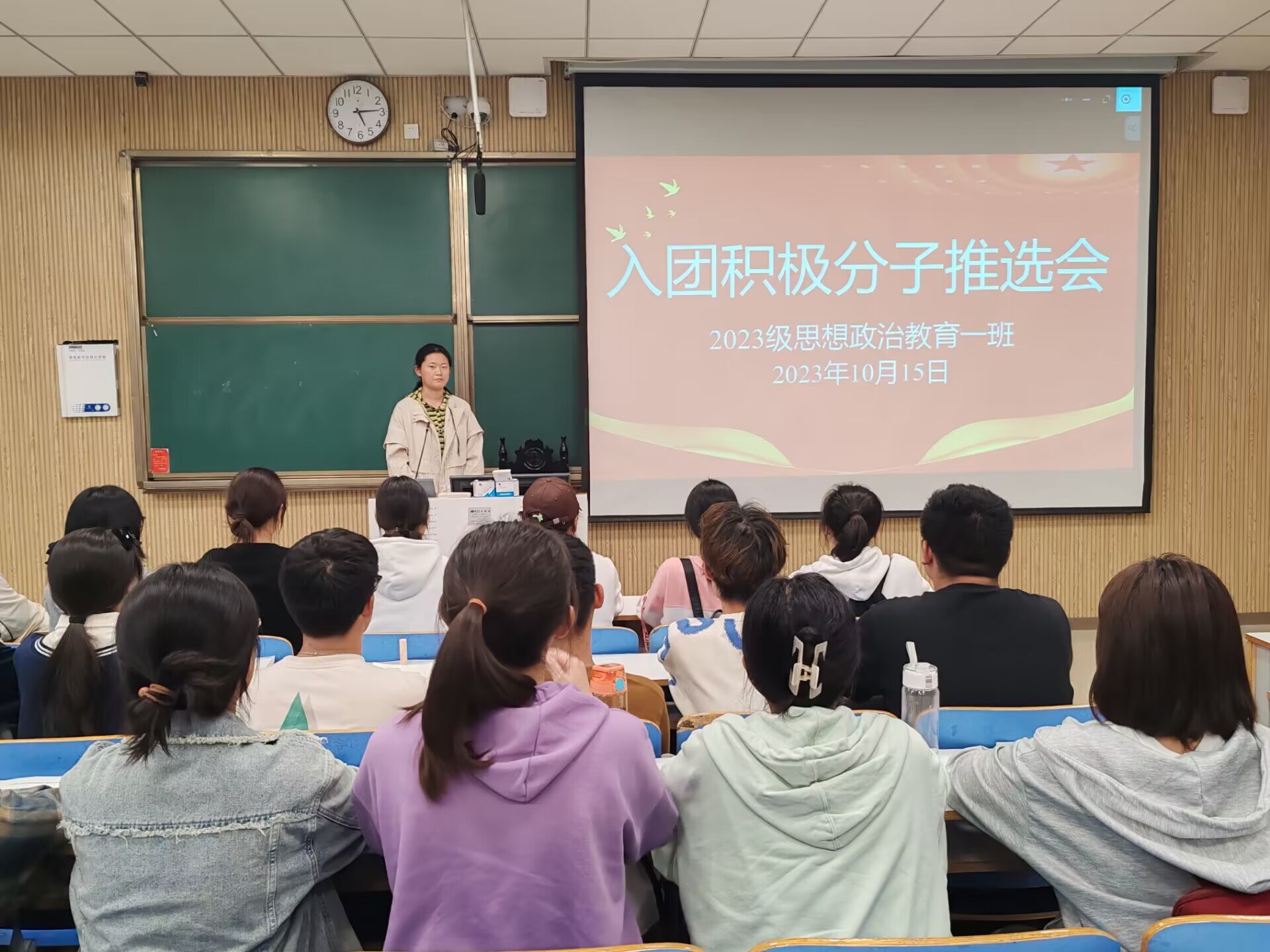 为进一步加强团组织建设,增强团支部的凝聚力,积极开展团青工作,10月15日下午,beat365亚洲版官网2023级思想政治教育一班在社科楼514教室召开入团积极分子推选班会。beat365官网2023级思想政治教育一班全体同学共同参与本次班会,班会由团支书张卓主持。