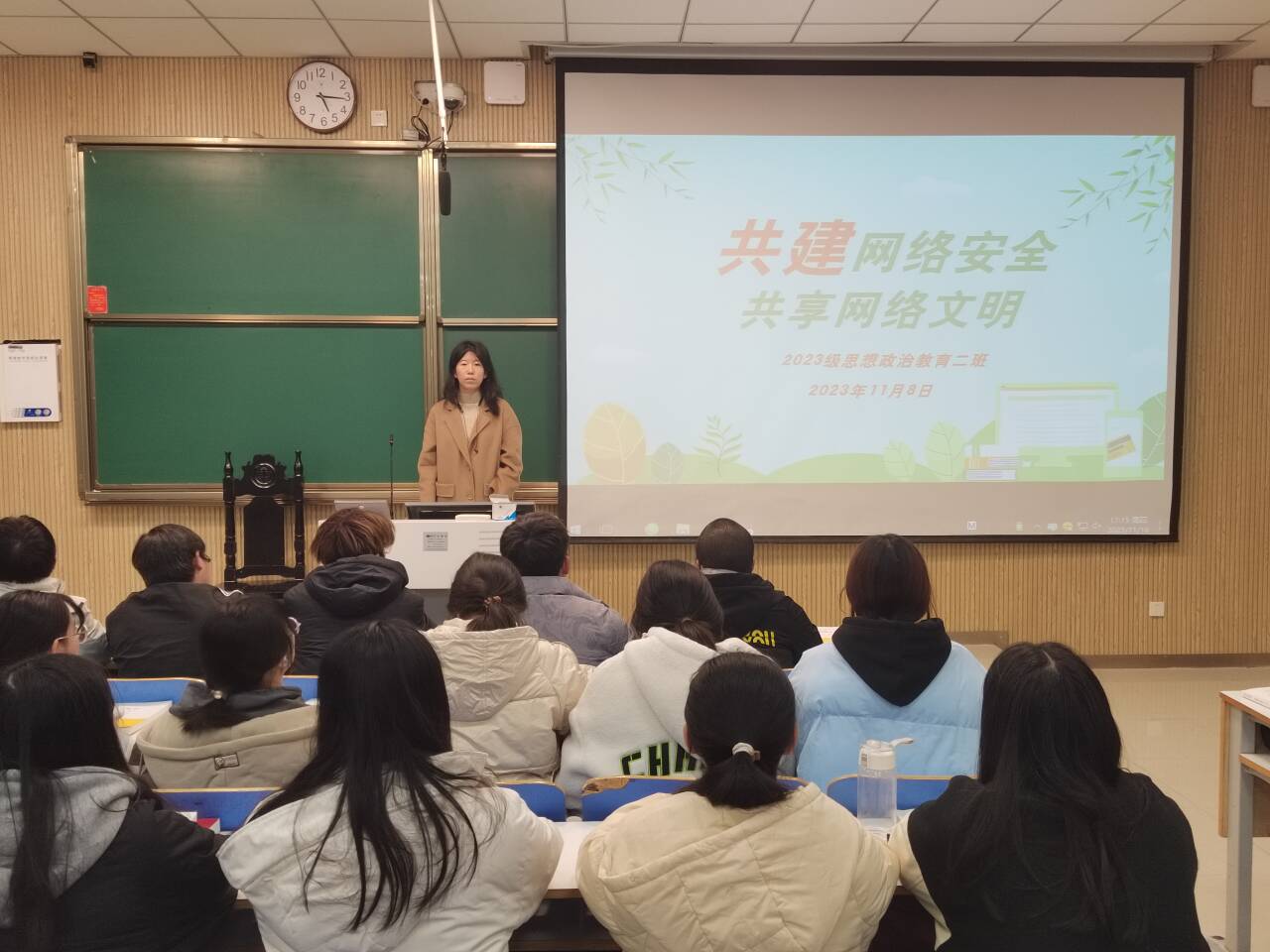为了更好地提高大学生网络安全防范意识,共建共享网络安全,11月8日上午,beat365亚洲版官网2023级思想政治教育二班在社科楼515教室召开“共建网络安全,共享网络文明主题团课”。本次团课由团支书王慜初主持。