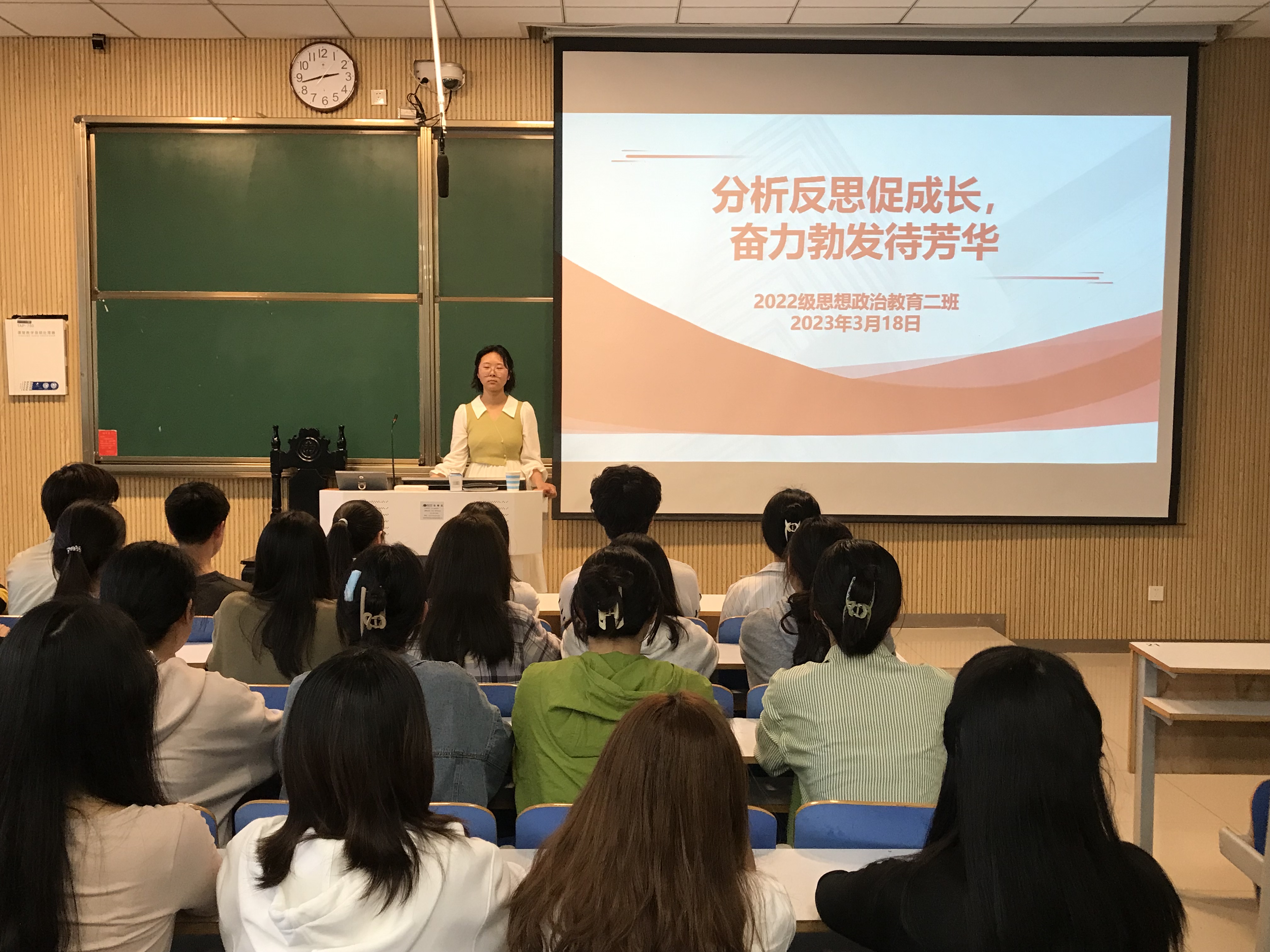 在学习中成长,于反思中进步。3月18日下午,beat365亚洲版官网2022级思想政治教育二班在社科楼515教室召开“分析反思促成长 奋力勃发待芳华”主题班会。2022级思想政治教育二班全体同学共同参加会议。班会由学习委员谢佳邑主持。