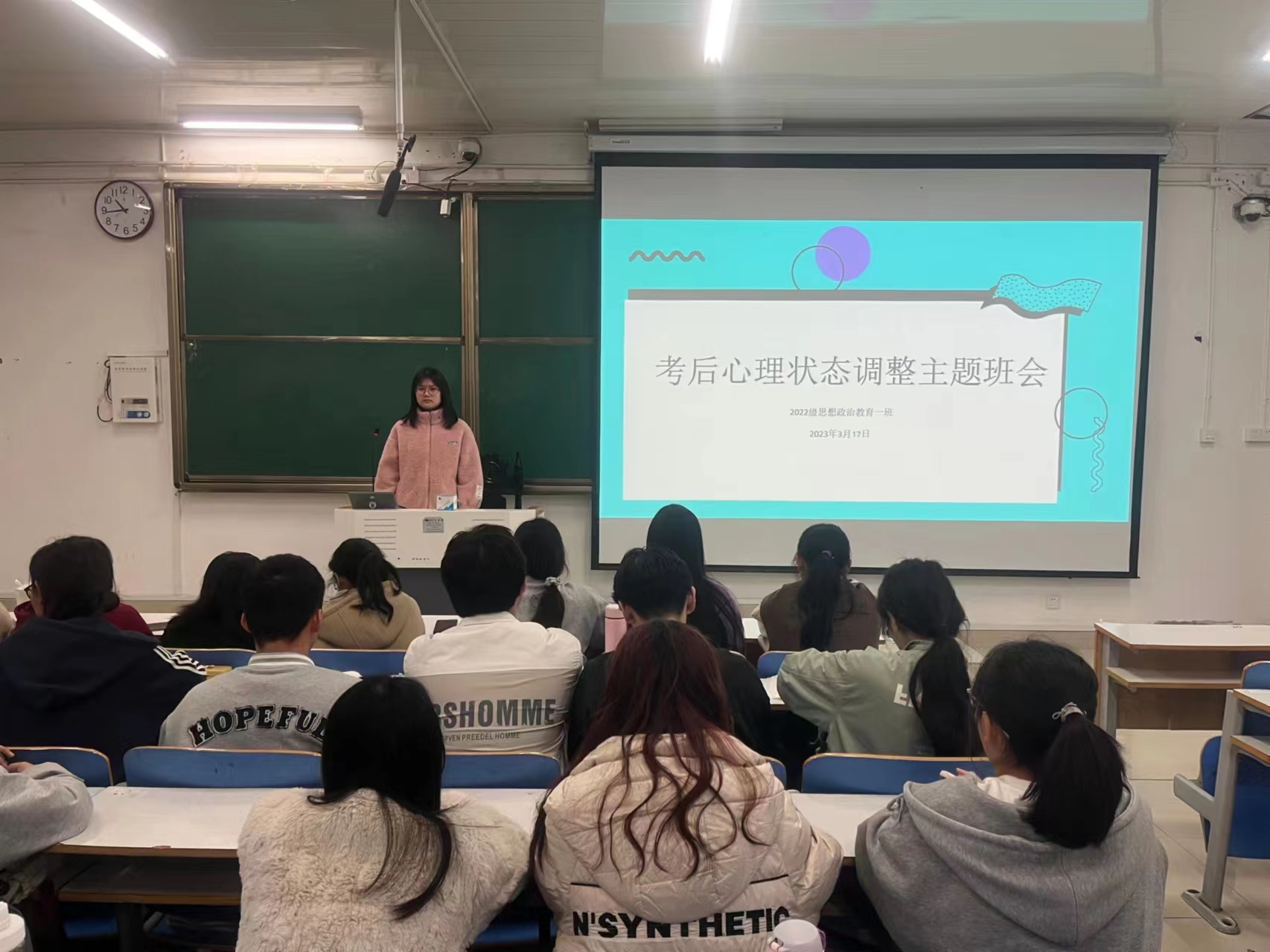 为做好考后心理调适工作,带动同学们更好地投入新学期学习,3月17日上午,beat365亚洲版官网2022级思想政治教育一班在社科楼514教室召开“考后心理状态调整”主题班会。2022级思想政治教育一班全体同学参与本次班会,班会由心理委员马思源主持。