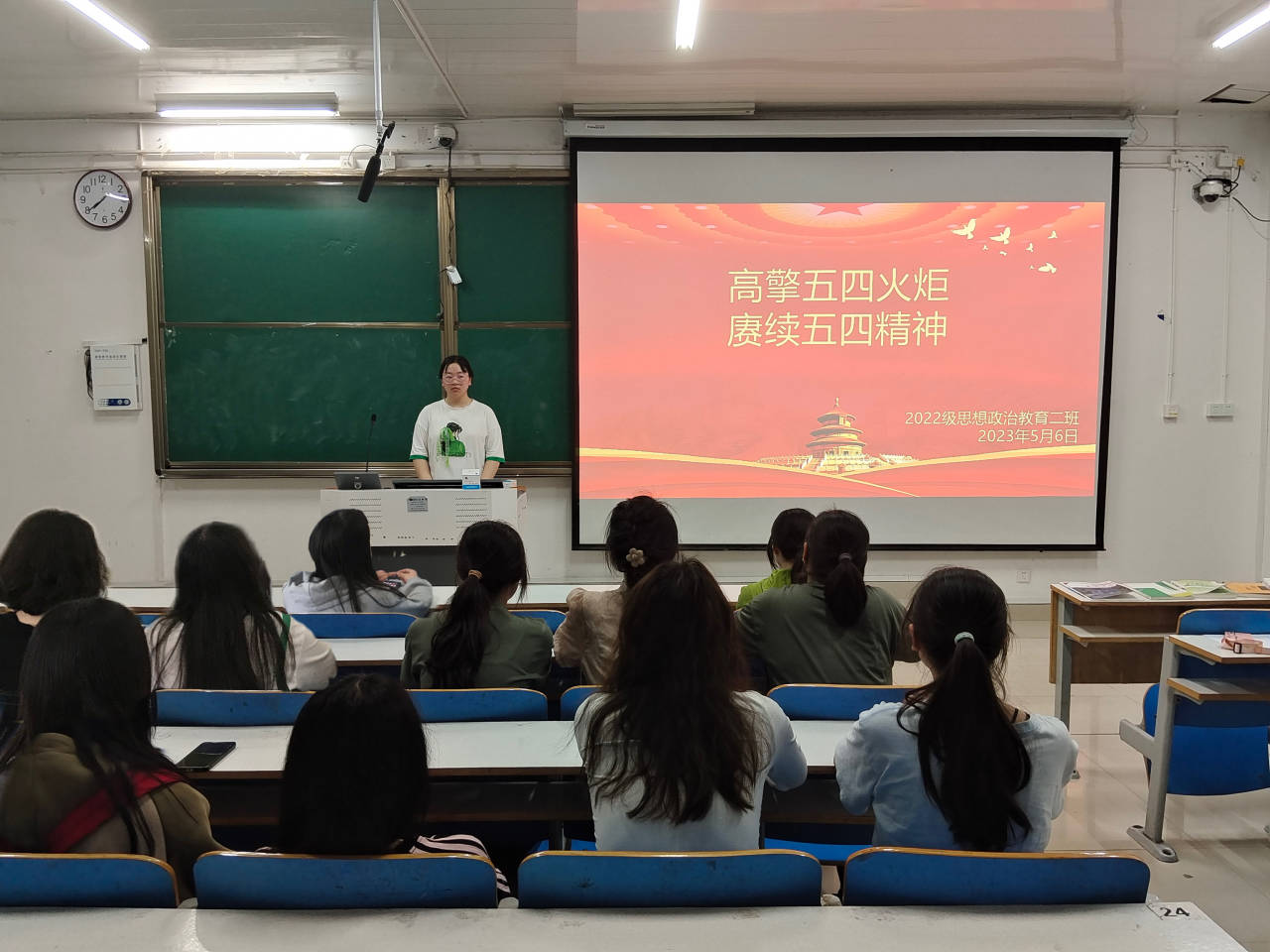 团课伊始,李佳音从五四青年节的来历、五四精神的具体内涵和学习五四精神的意义三方面进行阐述,引导同学们学史明理、强化担当。随后,同学们就“如何继续弘扬五四精神”展开讨论,其中张诗晨发言条理清晰、好句不断,如“厚植爱国情怀”、“练就过硬本领”、“锤炼品德修为等,并结合现实生活为同学们提出切实可行的建议。最后,李佳音强调,作为一名思政学子,我们要努力学习科学文化知识,加快知识体系更新,使自己的思维视野、思想观念、认识水平跟上越来越快的时代发展,以真才实学服务人民、贡献国家。