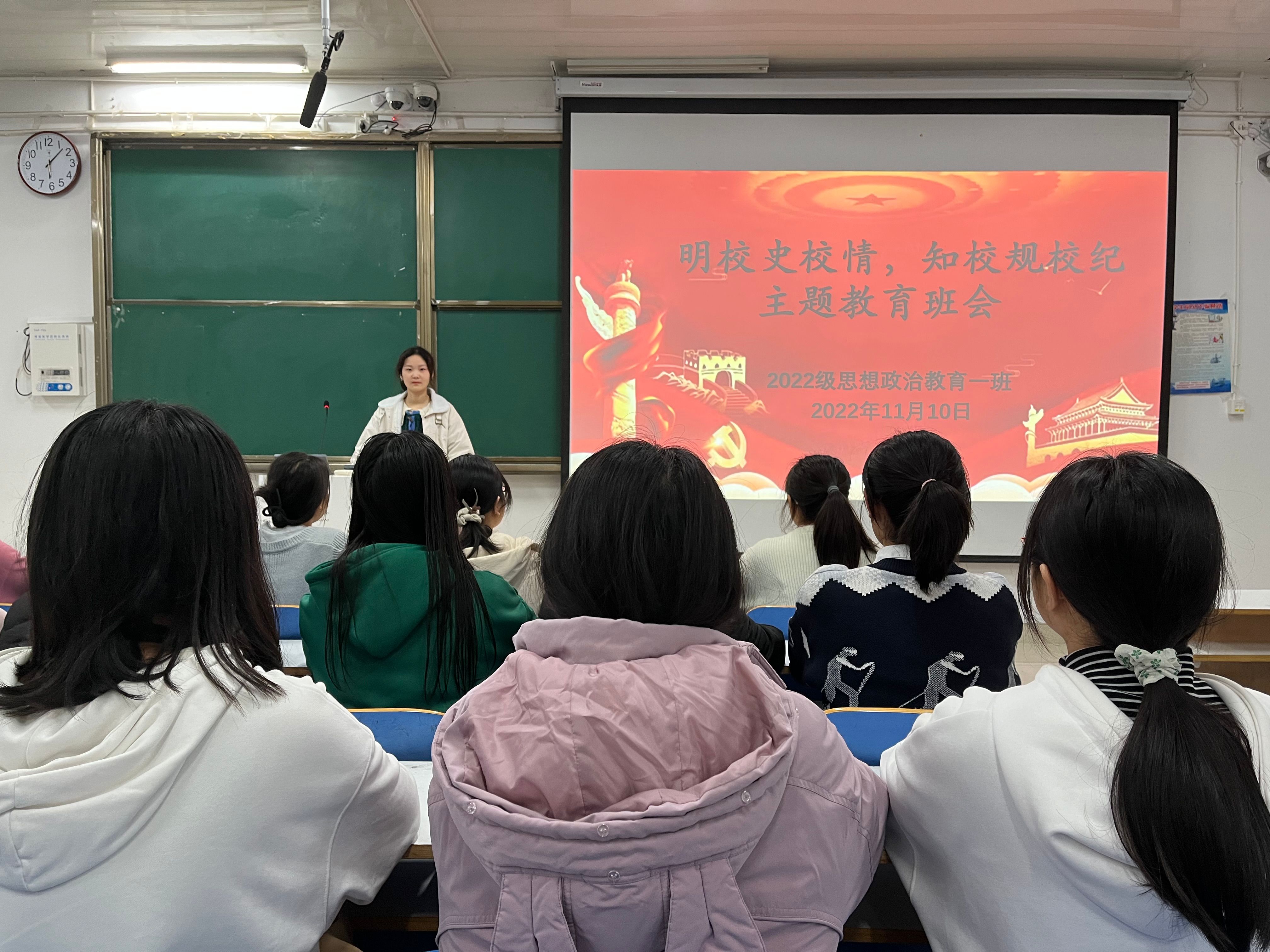为加强同学们对校史的了解,坚定理想信念,11月10日下午,beat365亚洲版官网2022级思想政治教育一班在社科楼514教室召开 “明校史校情,知校规校纪”主题班会。2022级思想政治教育一班全体同学参与本次班会,班会由团支书李佳茹主持。