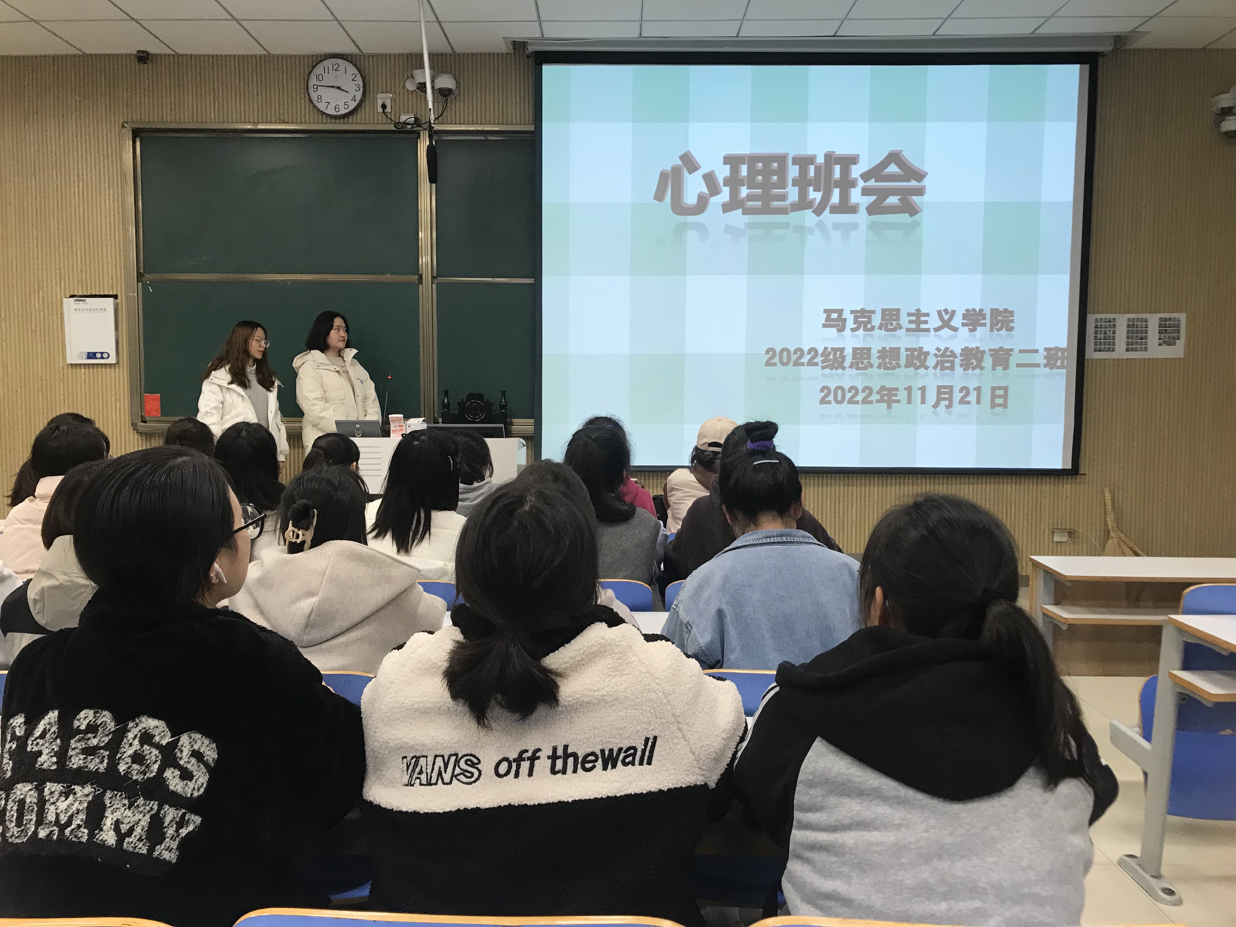为更好贯彻党的教育方针,落实立德树人根本任务,11月21日下午,beat365亚洲版官网2022级思想政治教育二班在社科楼515教室召开心理教育主题班会。2022级思想政治教育二班全体同学共同参加会议。本次会议由心理委员张嘉芮和文体委员马路畅主持。