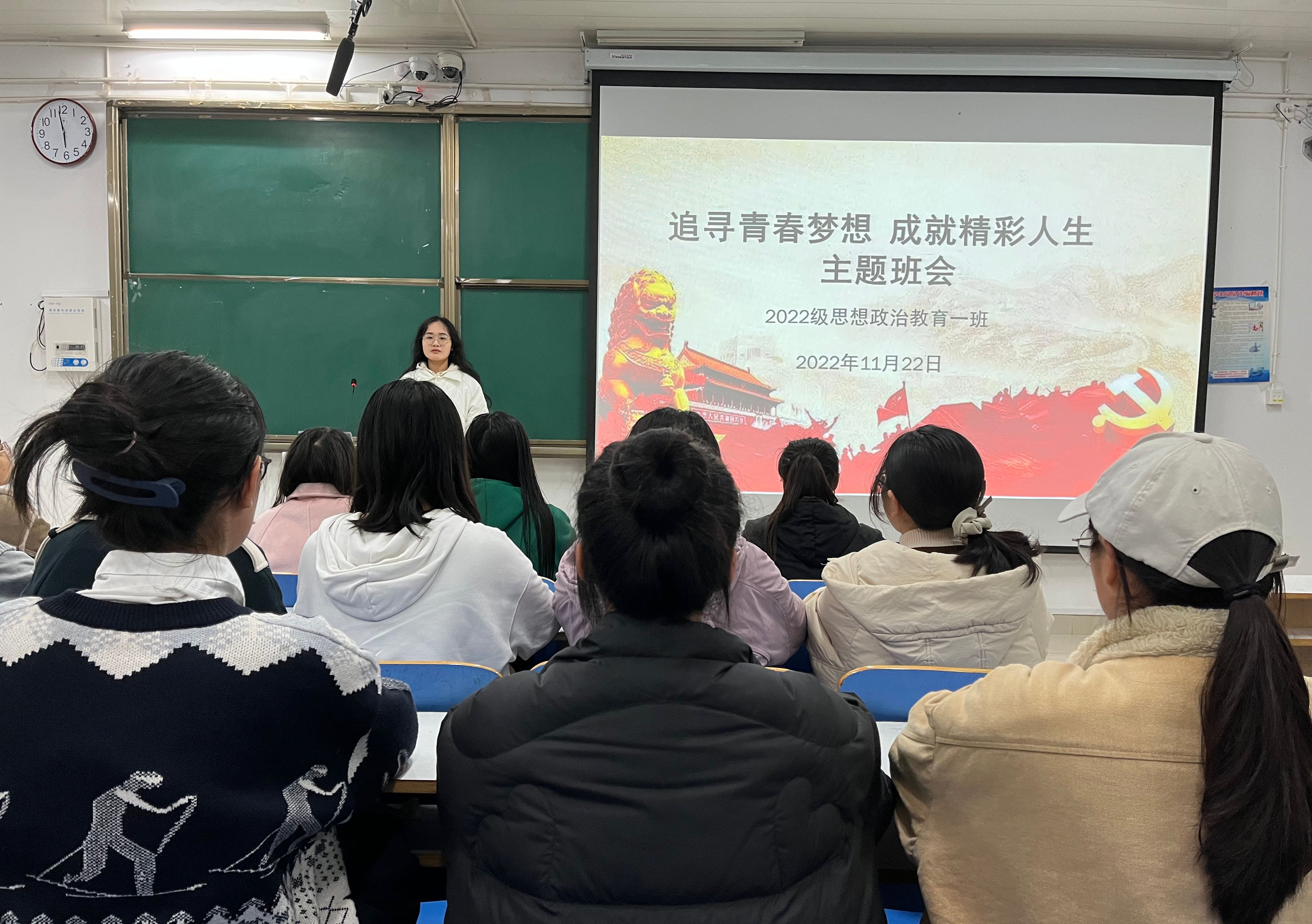 为帮助同学们确立人生目标,实现远大理想,11月22日下午,beat365亚洲版官网2022级思想政治教育一班在社科楼514教室召开“追寻青春梦想,成就精彩人生”主题班会。2022级思想政治教育一班全体同学参与本次班会,班会由学习委员司露主持。