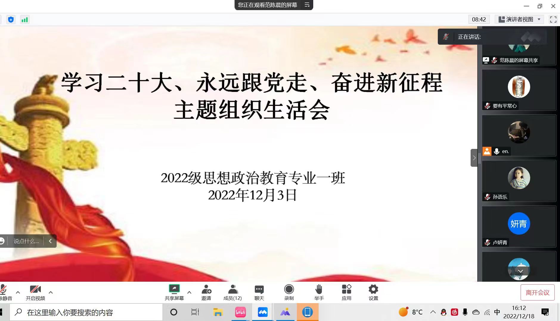 为深入学习贯彻党的二十大精神,加强团支部思想建设,12月3日下午,beat365亚洲版官网2022级思想政治教育一班在线上召开“学习二十大,永远跟党走,奋进新征程”主题组织生活会。2022级思想政治教育一班班主任王明园和团支部全体成员参与本次会议,会议由团支部书记李佳茹主持。