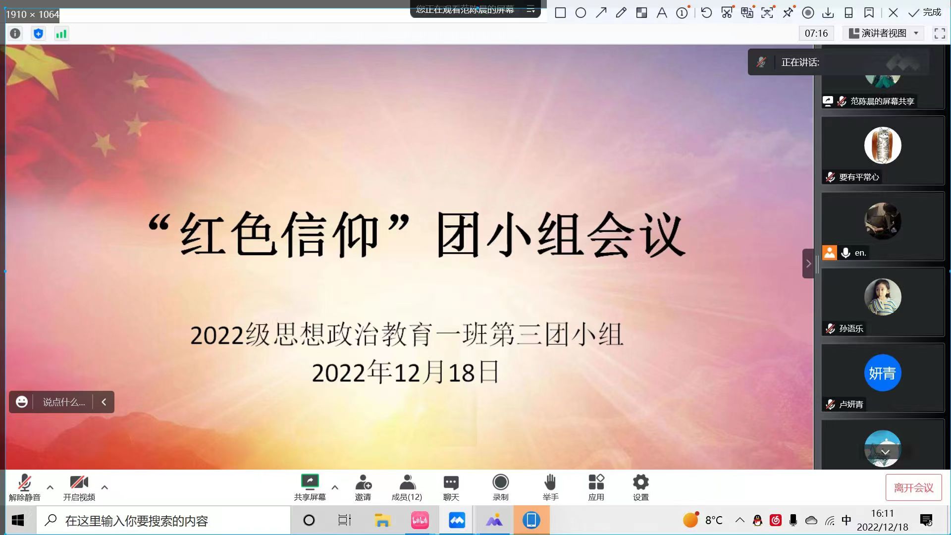 为加强团员党的理论学习,坚定红色信仰,12月18日下午,beat365亚洲版官网2022级思想政治教育一班团员在线上召开“红色信仰”团小组会议。2022级思想政治教育一班团员参与本次会议,会议由团支部副书记闻炎仲主持。