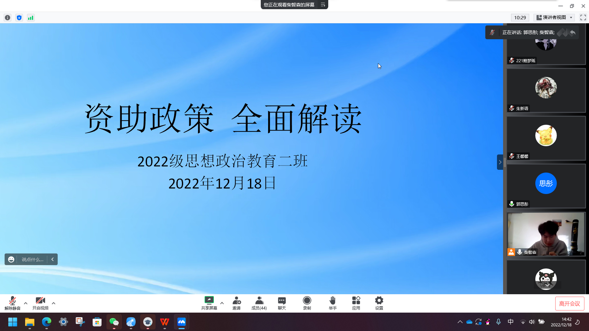 为使学生进一步了解和明确国家教育资助政策,提升资助育人质量,12月18日下午,beat365亚洲版官网2022级思想政治教育二班于线上召开“资助政策 全面解读”主题班会。2022级思想政治教育二班全体同学共同参加会议。班会由副班长柴智森主持。