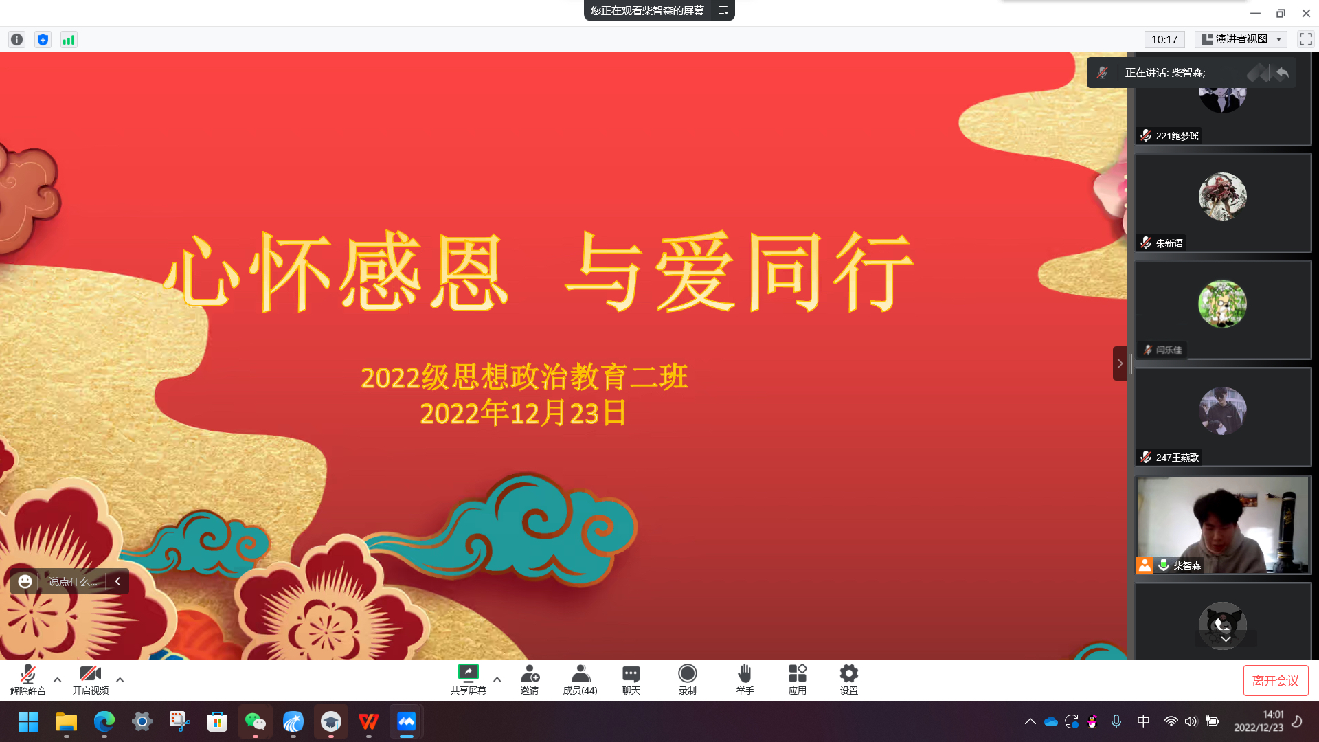 为更好贯彻“五育并举,德育为先”的教育理念,弘扬中华民族传统美德,12月23日下午,beat365亚洲版官网2022级思想政治教育二班于线上召开“心怀感恩 与爱同行”主题班会。2022级思想政治教育二班全体同学共同参加会议。班会由副班长柴智森主持。