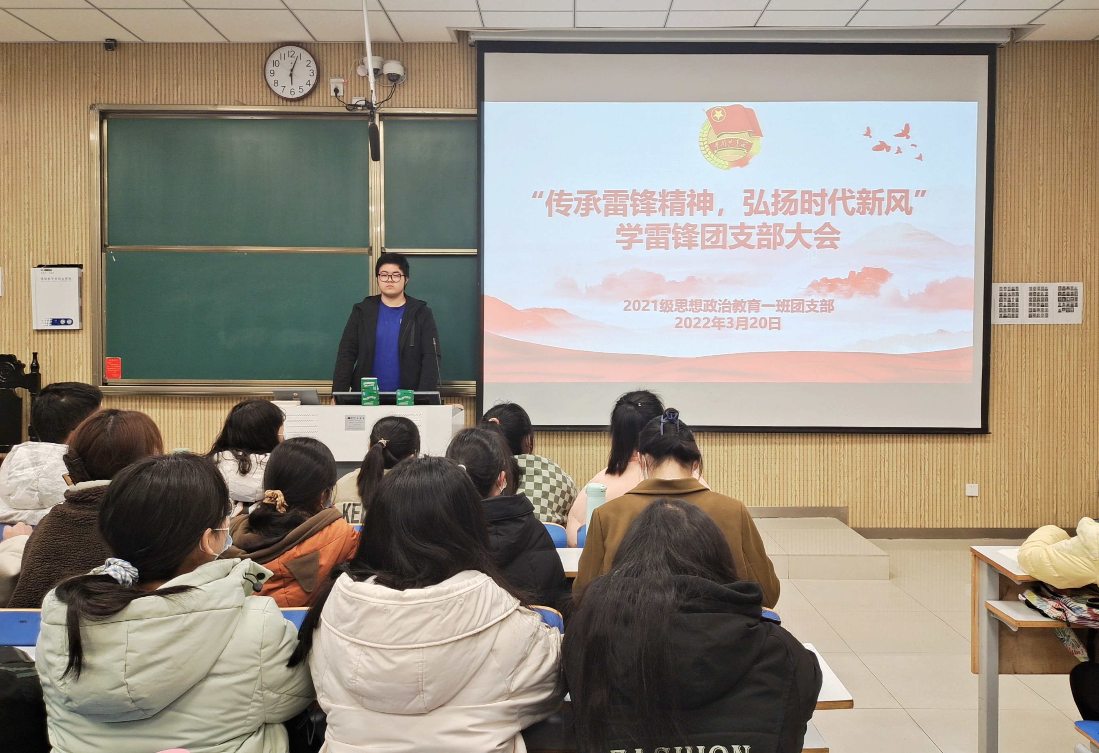 3月20日下午,beat365亚洲版官网2021级思想政治教育一班在社科楼515教室召开“传承雷锋精神,弘扬时代新风”学雷锋团支部大会。2021级思想政治教育一班全体团员共同参加了本次会议。会议由团支书戴翰林主持。