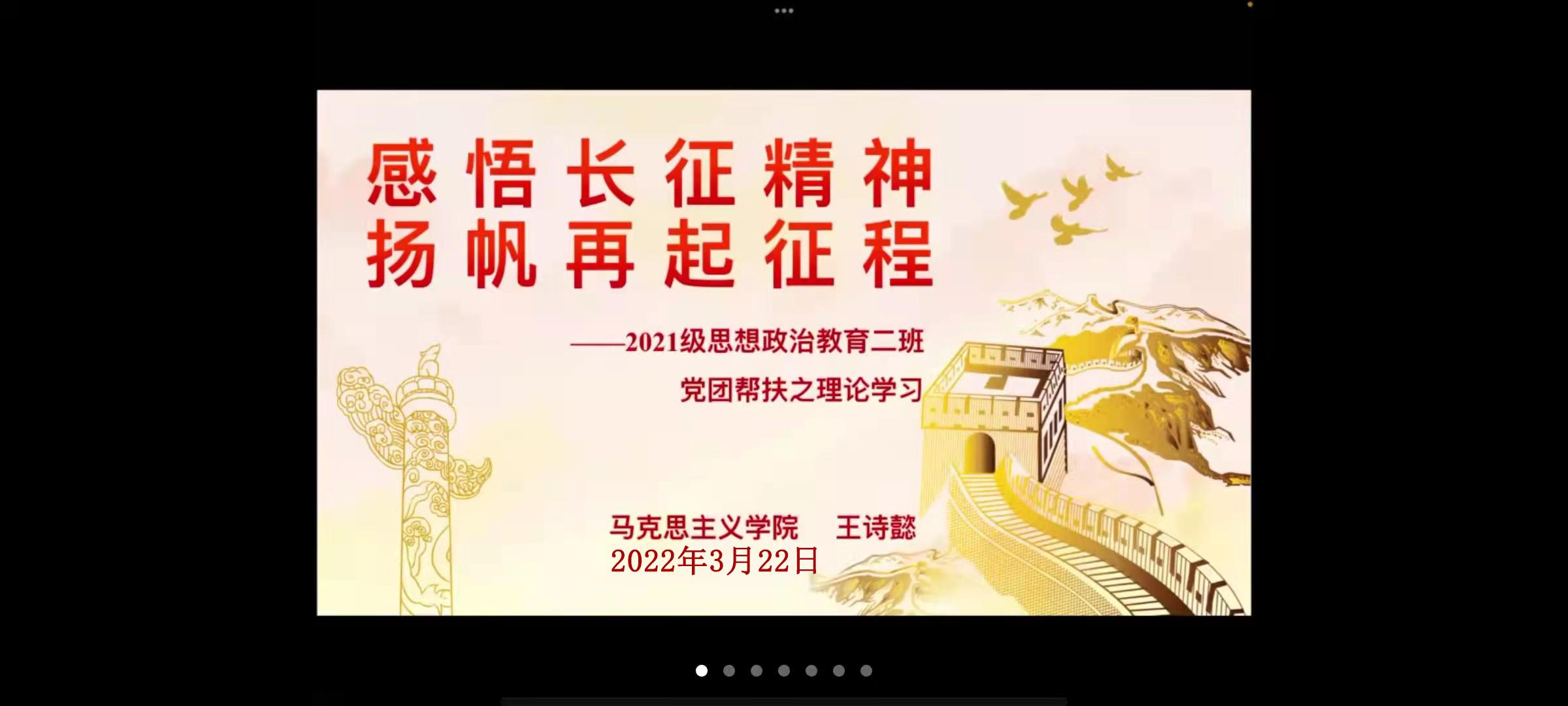 3月22日下午,beat365亚洲版官网2021级思想政治教育二班在腾讯会议举办“感悟长征精神,扬帆再起征程”党团帮扶之理论学习活动。2019级思想政治教育一班预备党员王诗懿、赵佳莹以及2021级思想政治教育二班全体团员参与此次活动,活动由团支书王婧欣主持。