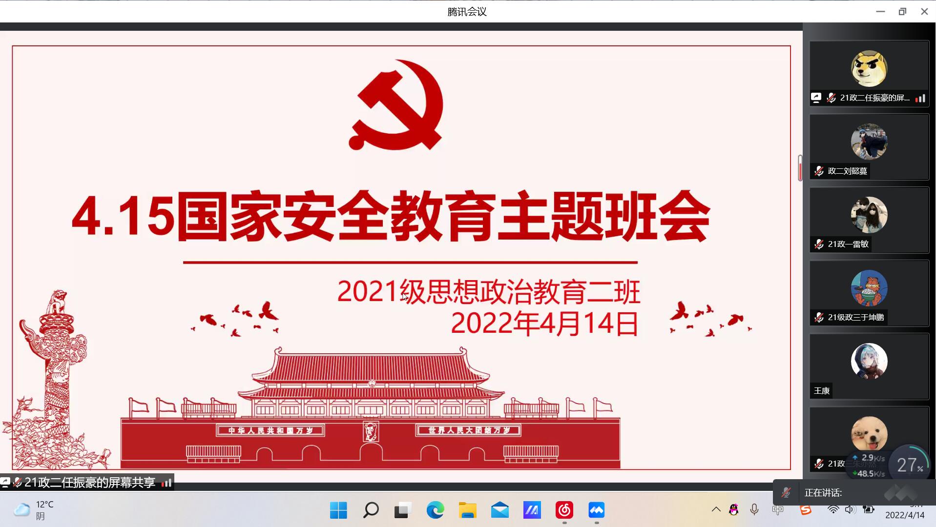 4月14日,beat365亚洲版官网2021级思想政治教育二班在腾讯会议召开“4.15国家安全教育”主题班会。2021级思想政治教育二班全体成员参与此次主题班会,班会由团支书王婧欣主持。