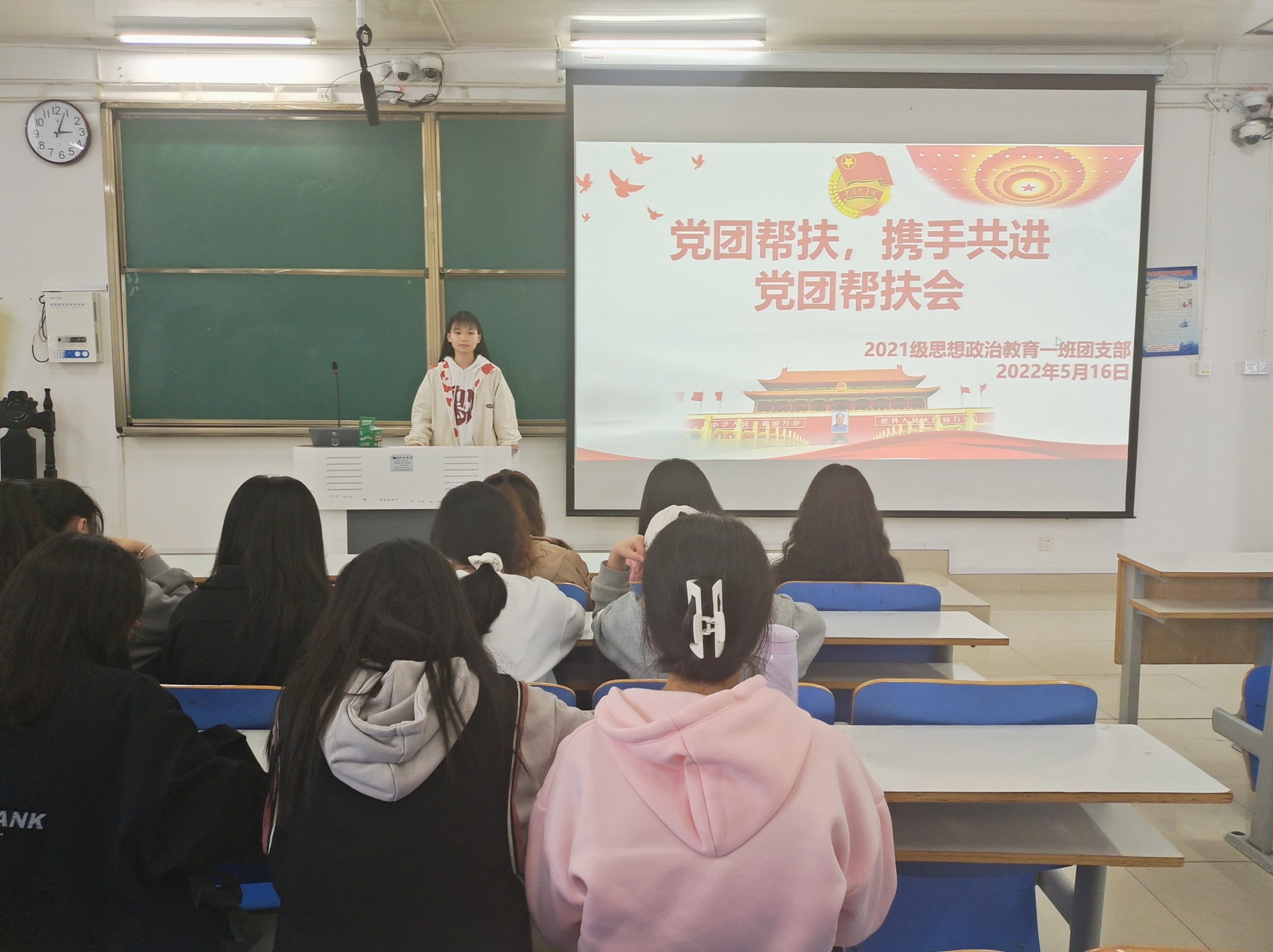 5月16日下午,beat365亚洲版官网2021级思想政治教育一班在社科楼514教室召开“党团帮扶,携手共进”党团帮扶会。2019级思想政治教育一班正式党员刘鹏、宋雨潇以及2021级思想政治教育一班全体团员共同参加了本次会议。会议由团支书戴翰林主持。