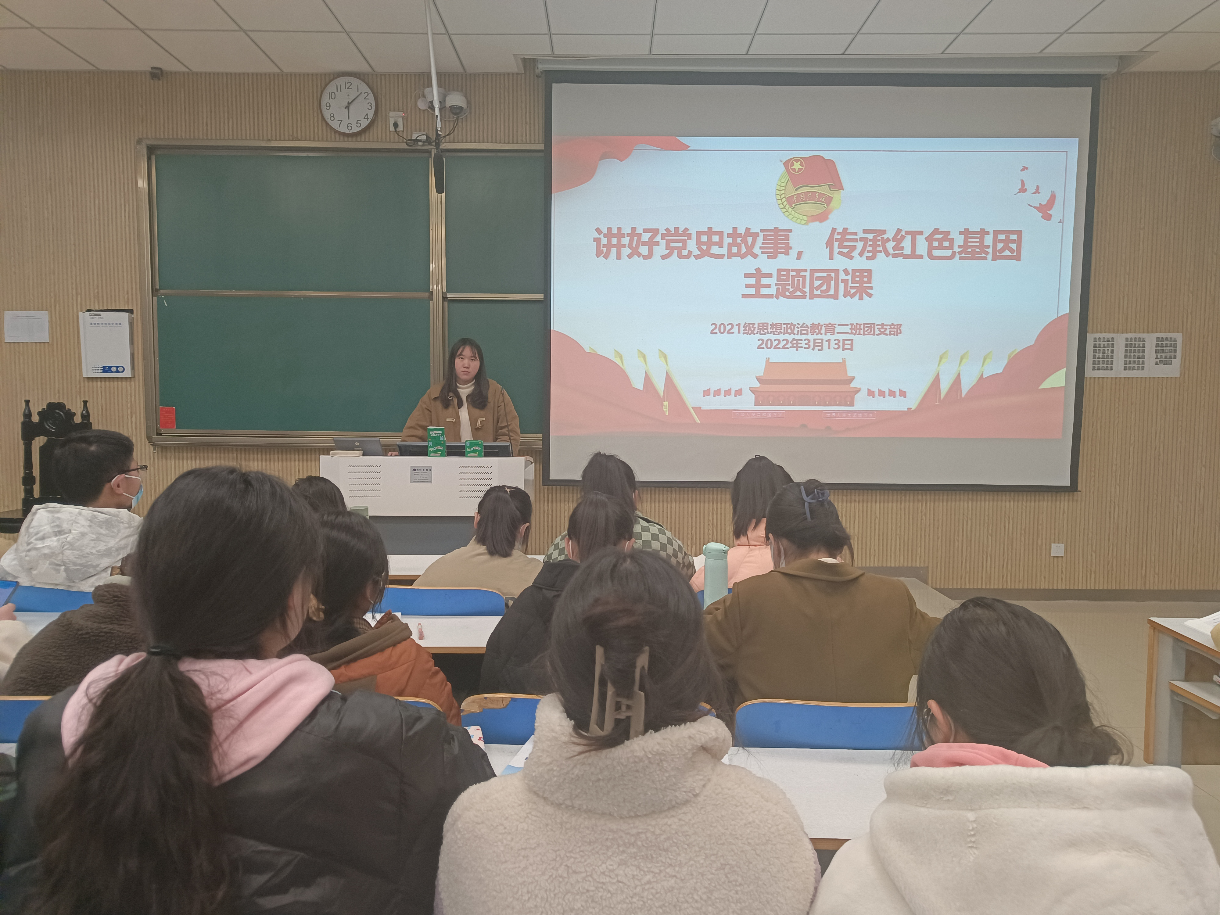 3月13日下午,beat365亚洲版官网2021级思想政治教育二班在社科楼515教室召开“讲好党史故事,传承红色基因”主题团课。2021级思想政治教育二班全体团员参加此次团课,团课由团支书王婧欣主持。