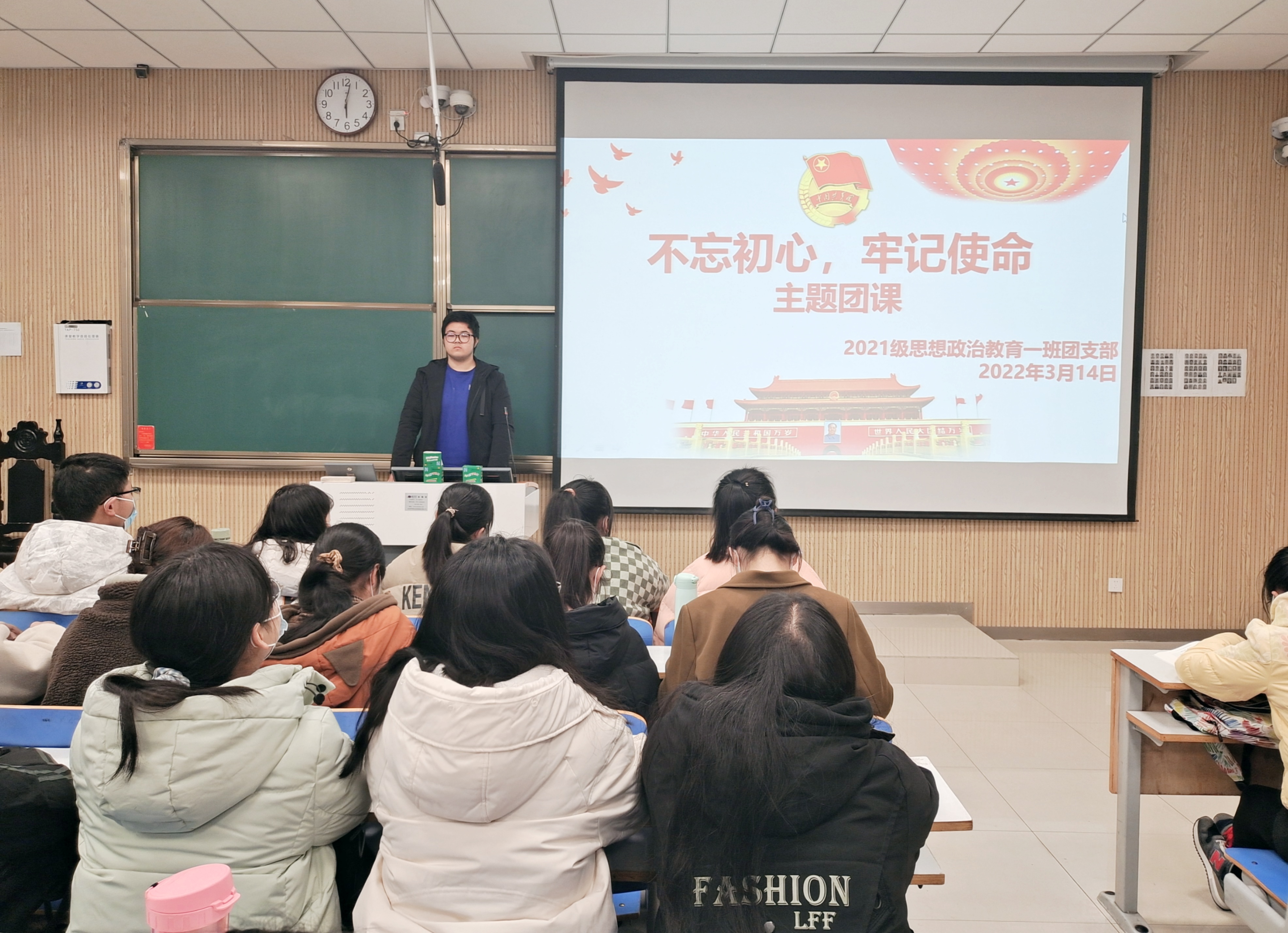 3月14日下午,beat365亚洲版官网2021级思想政治教育一班在社科楼515开展“不忘初心,牢记使命”主题团课。2021级思想政治教育一班全体团员共同参加了本次会议。会议由团支书戴翰林主持。