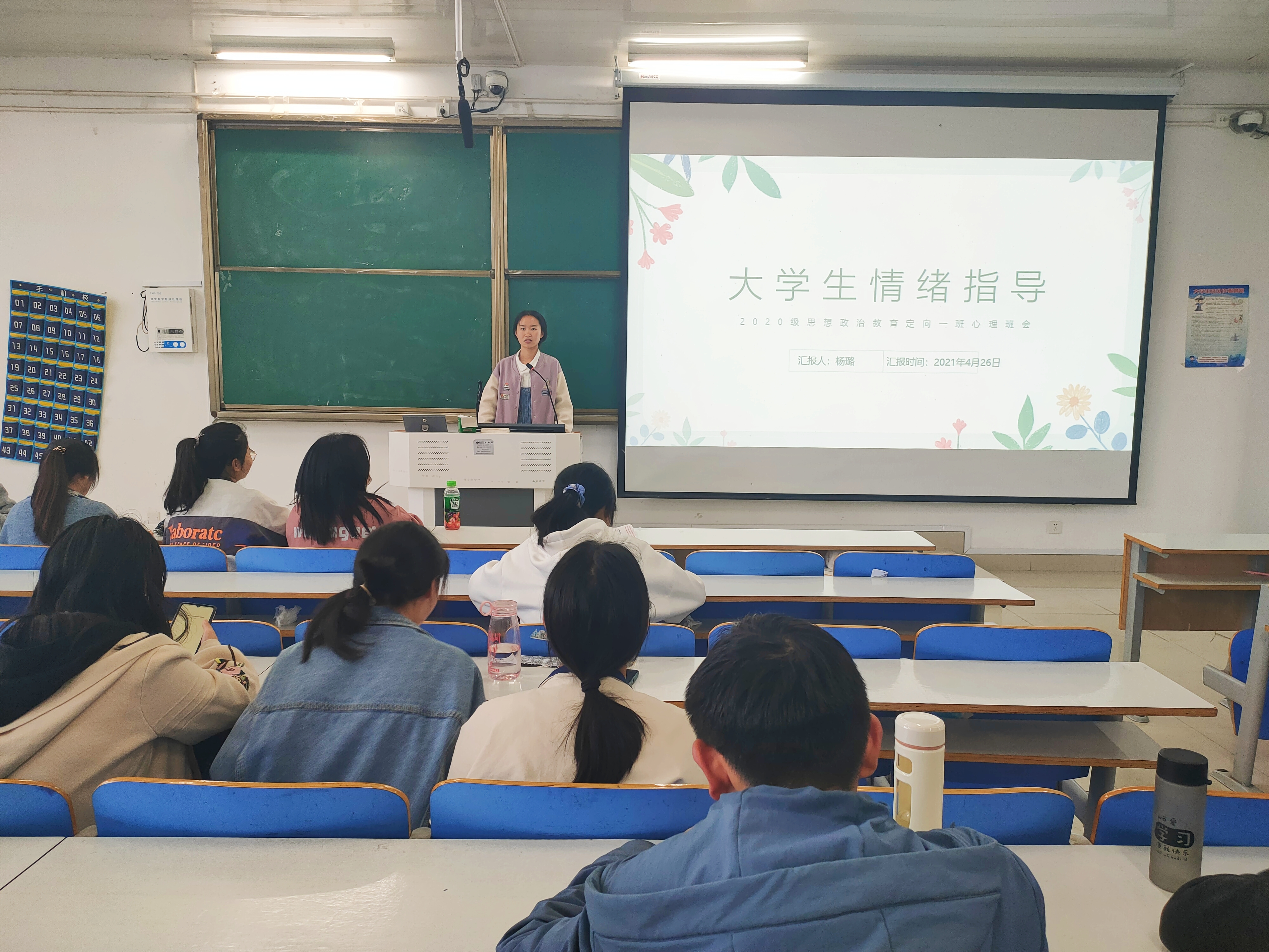 4月26日下午,beat365亚洲版官网思想政治教育(定向)一班在社科楼514教室顺利举办“大学生情绪指导”心理班会。beat365亚洲版官网思想政治教育(定向)一班全体学生聆听了此次班会,班会由生活委员杨璐主持。