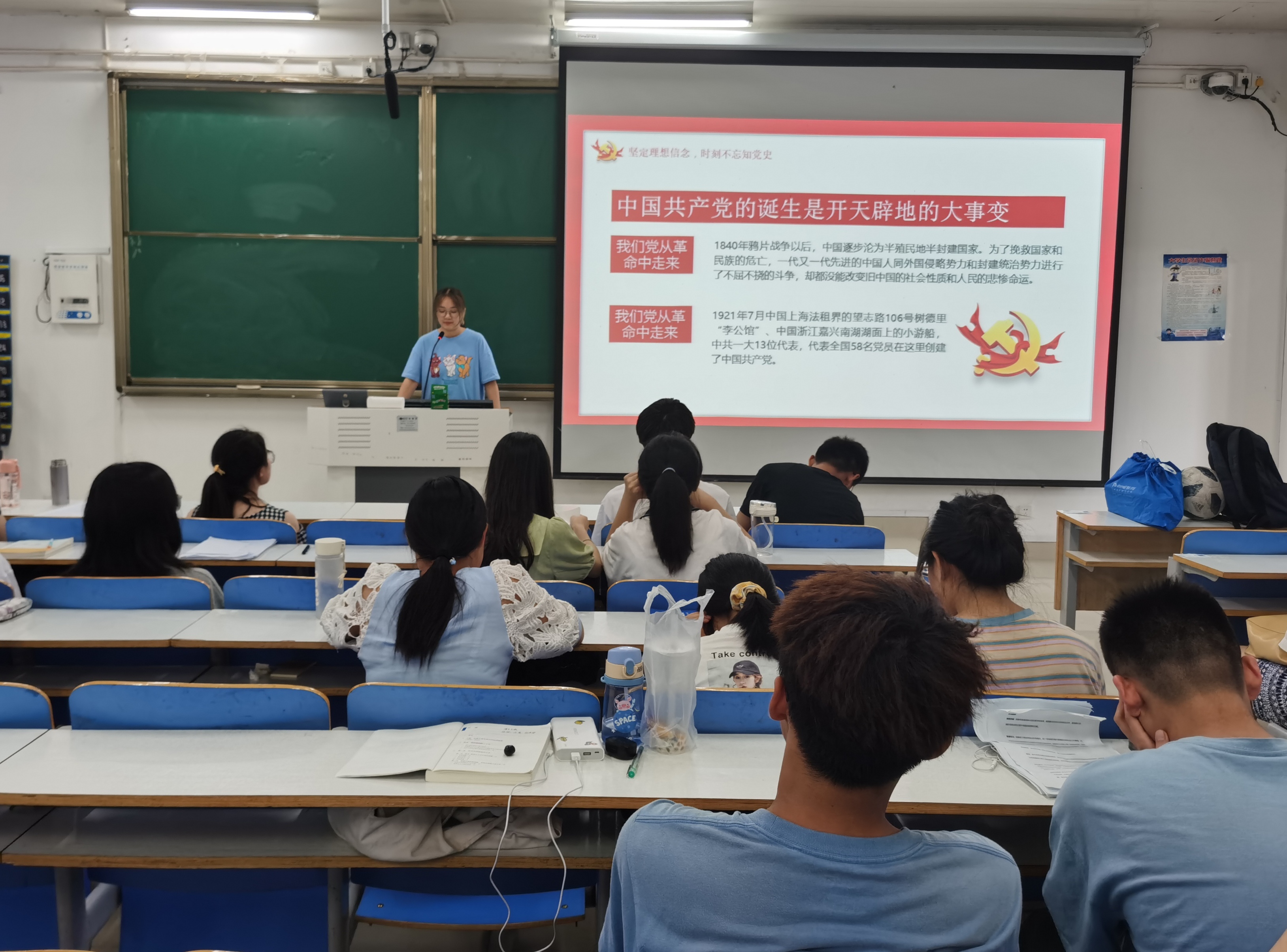 大会伊始,团支书卢茜雨指出,每位同学都要在新时代展现新担当新作为、更加自觉地为实现新时代党赋子的历史使命而努力奋斗。随后,卢茜雨从“坚定理想信念,时刻不忘知党史”、“补足精神之钙,时刻不忘感党恩”、“践行初心使命,一心一意跟党走”三个方面来讲述本次大会。她通过PPT演示的方式讲解了中国共产党诞生的重大意义,生动地阐述了坚持全心全意为人民服务是马克思主义政党永远奋斗的根本保证,并说明了新时期党员干部的使命担当。接着,卢茜雨强调,同学们要学懂、弄通习近平新时代中国特色社会主义思想;旗帜鲜明讲政治、坚决做到“两个维护”;加强党性修养、党性锻炼,确保任何时候任何情况下都做到政治立场不移、政治方间不偏。最后,辅导员曹栋播放了贵州高架桥的纪录片,这个纪录片体现了党始终坚持以人民为中心,使同学们更加了解党对人民群众生活的关怀,增强了同学们对党的自信心和认同感。