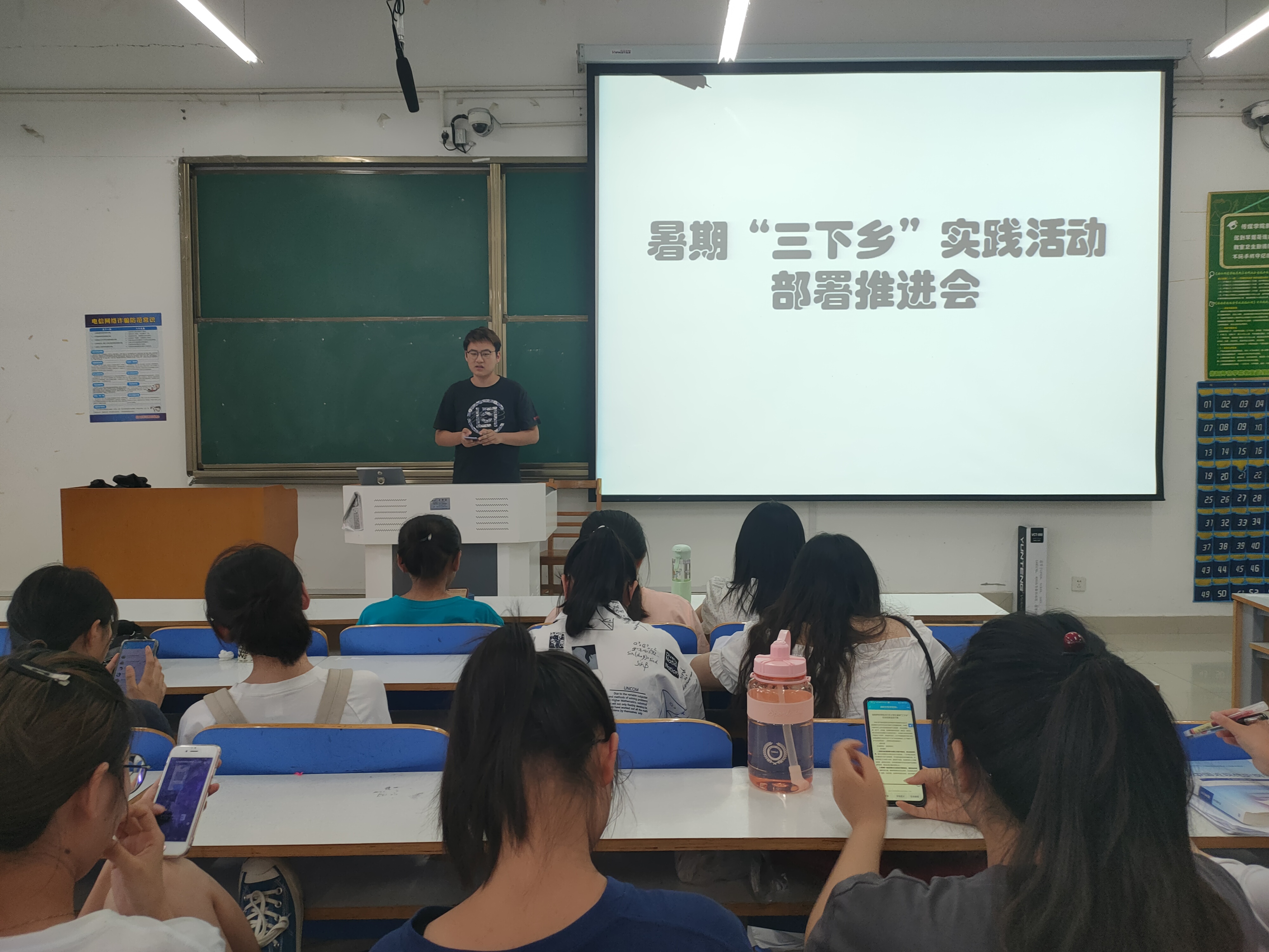 会议伊始,班长朱紫峰向同学们介绍了大学生暑假"三下乡"社会实践活动的具体项目及其原则,他强调,要把实地实践观察与思想认识提升相结合,突出活动导向性。接着,朱紫峰具体讲述了各个项目的主要内容,列举了党史学习实践团、理论宣讲实践团、国情观察实践团等社会实践活动团体。随后,朱紫峰根据同学们在各个地区的分布情况引导同学们自行结合进行分组,并要求各组及时填写申请书且及时上交。同学们纷纷积极分组参加此次暑期"三下乡"社会实践活动。