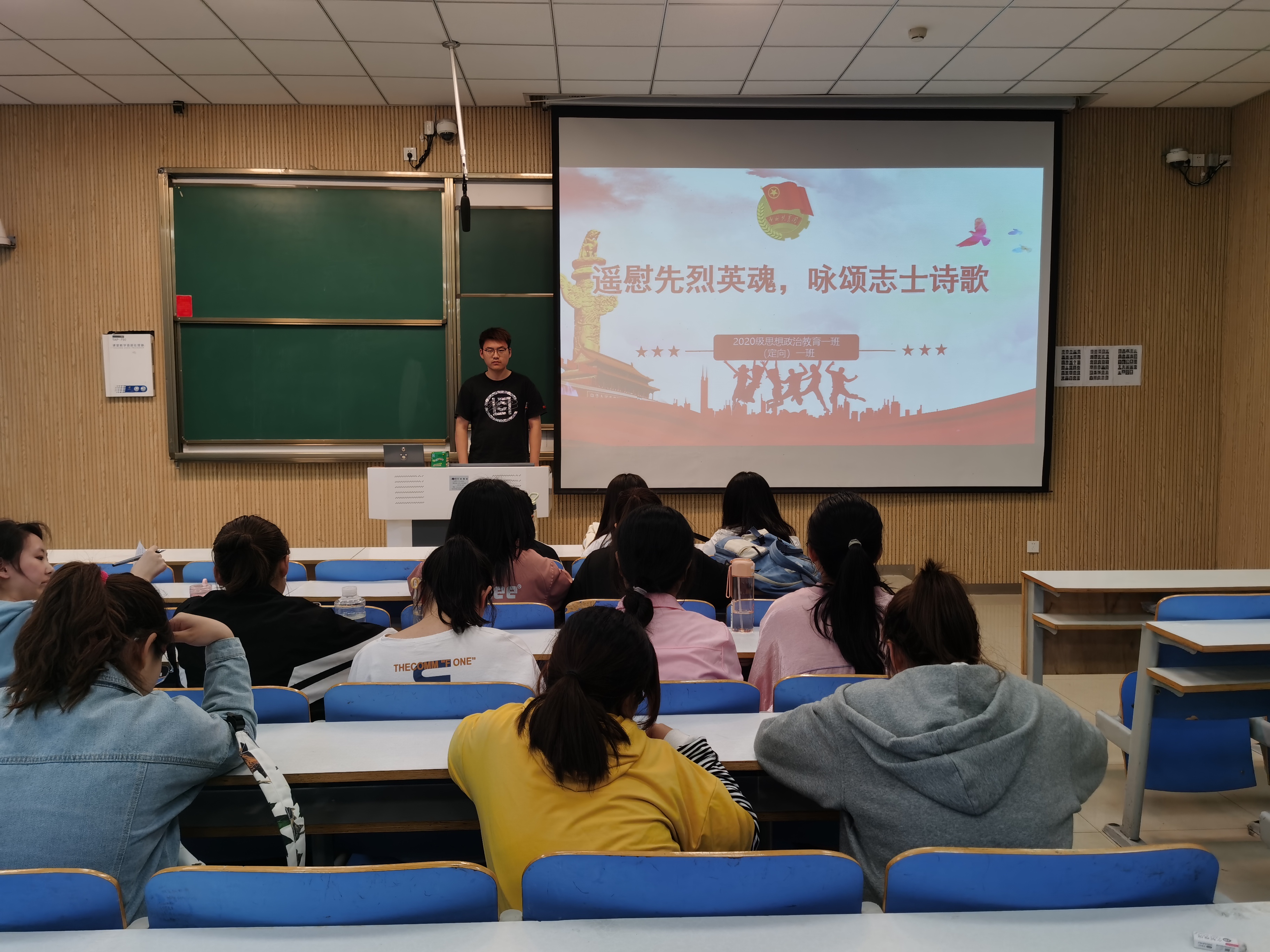 为缅怀先烈,咏颂志士,4月14日上午,2020级思想政治教育一班、定向一班在社科楼515教室顺利开展“遥畏先烈英魂,咏颂志士之歌”团日活动。活动由团支书朱紫峰主持。