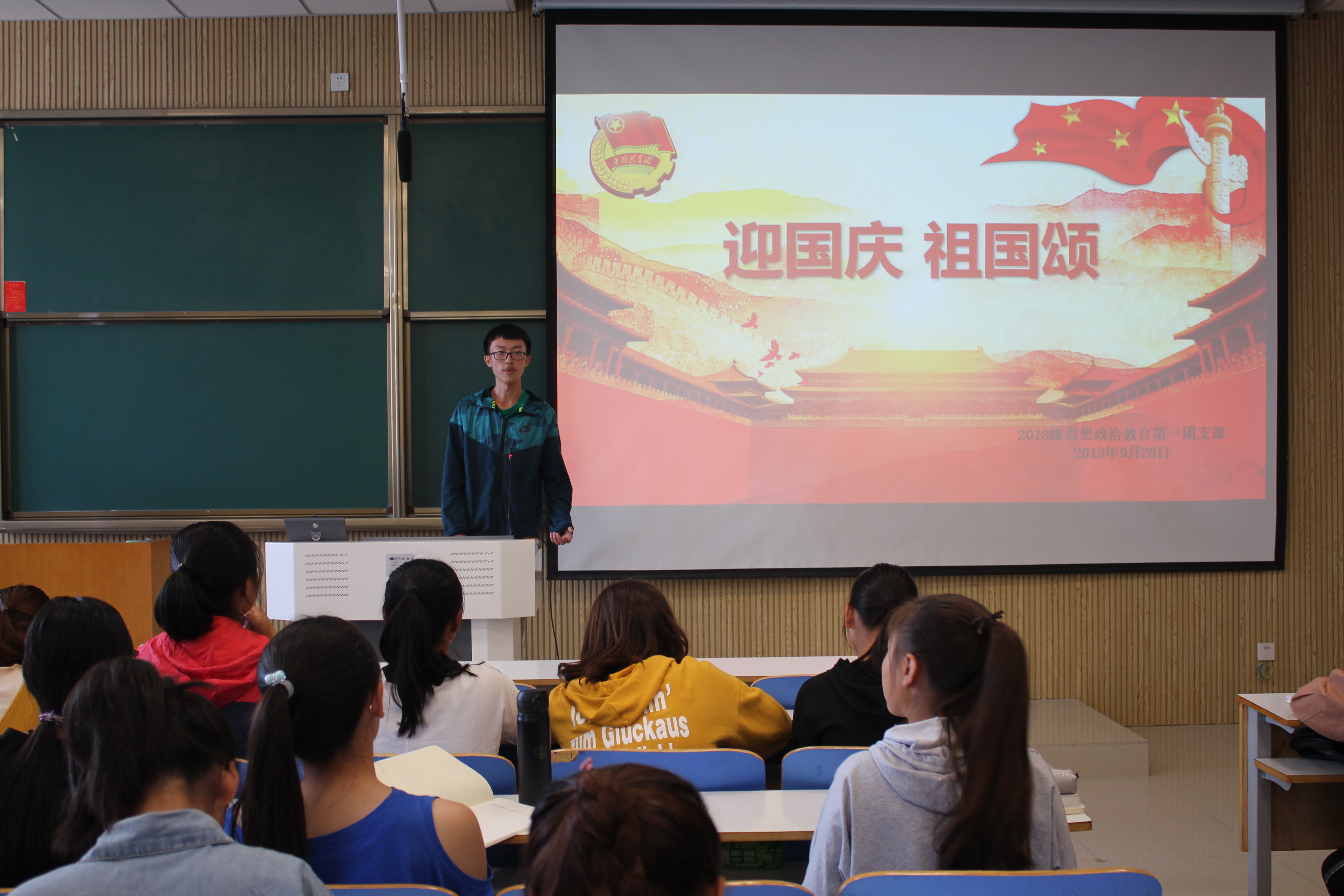精彩华诞,举国同庆。9月28日上午,beat365亚洲版官网2018级思想政治教育一班在社科楼515教室顺利开展“迎国庆,祖国颂”主题班会。2018级思政一班全体同学共同参加此次班会。班会由班长邢子豪主持。