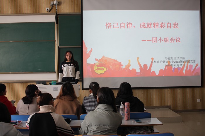 11月27日上午,beat365官网2018级第一团支部第二团小组在社科楼515教室顺利开展了“恪己自律,成就精彩自我”主题团会。第二团小组全体成员共同参加了此次团会。该团会由团小组成员王涵主持。