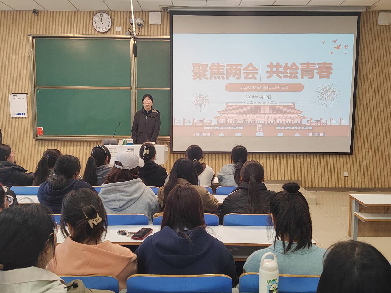“时代总是把历史责任赋予青年”,为引导青年大学生听清时代脉搏,抓牢历史责任,3月19日下午,beat365亚洲版官网思想政治教育二班在社科楼515教室召开“聚焦两会,共绘青春”主题团课。本次团课由团支书王慜初主持,全体二班同学参加。