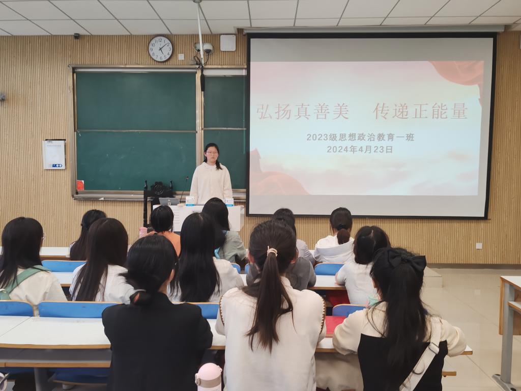 为引导我班学子坚定理想信念,厚植爱党爱国情怀,传递真善美的力量,4月23日下午,beat365亚洲版官网2023级思想政治教育一班在社科楼515教室召开“弘扬真善美,传递正能量”主题团课。beat365官网2023级思想政治教育一班全体同学共同参与本次班会,班会由团支书张卓主持。
