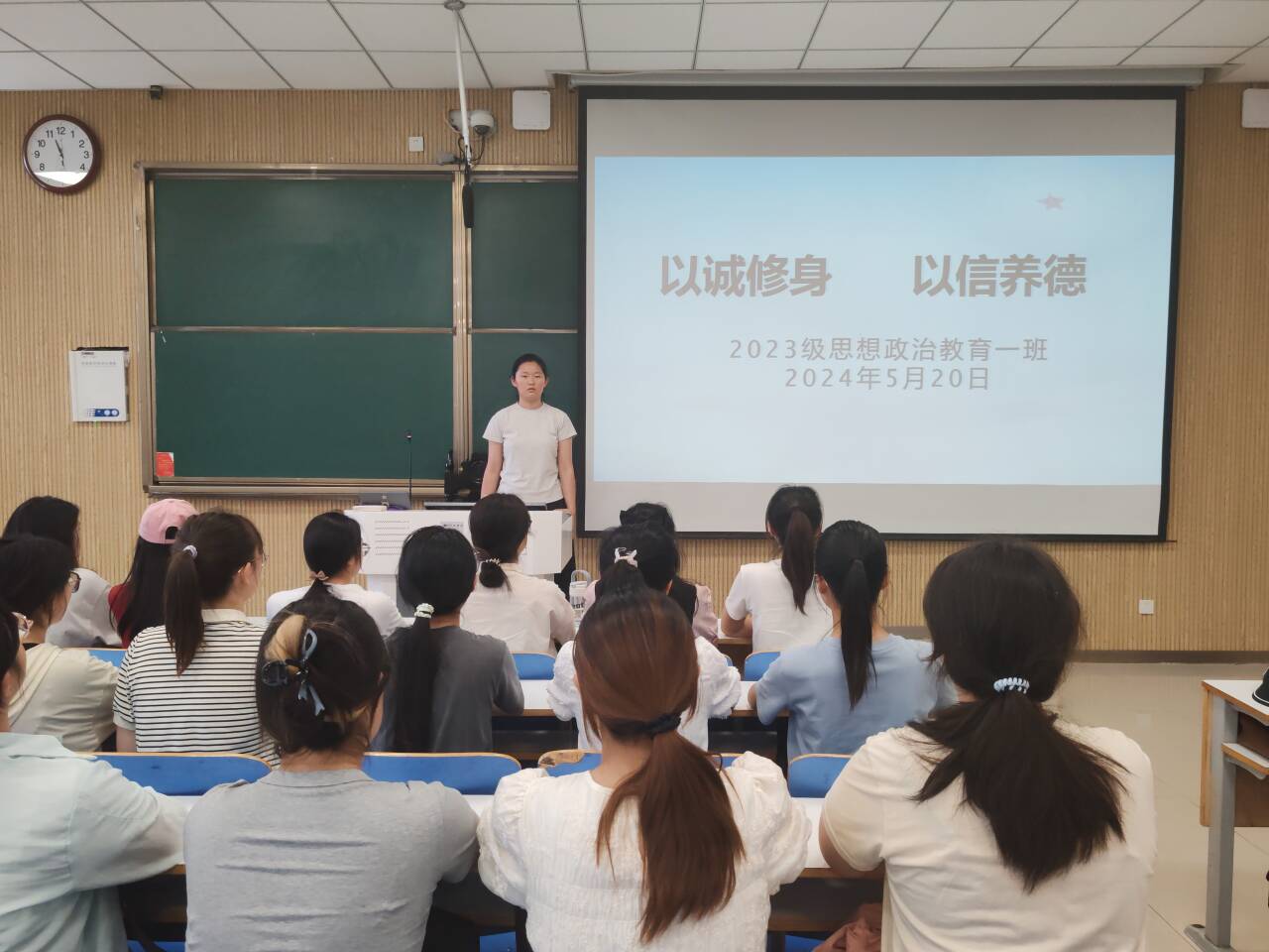 为深入贯彻落实习近平总书记关于立德树人的重要论述和讲话精神,倡导和践行社会主义核心价值观,5月20日上午,beat365亚洲版官网2023级思想政治教育一班在社科楼515教室召开“以诚修身,以信养德”主题班会。beat365官网2023级思想政治教育一班全体同学共同参与本次班会,班会由班长张卓主持。