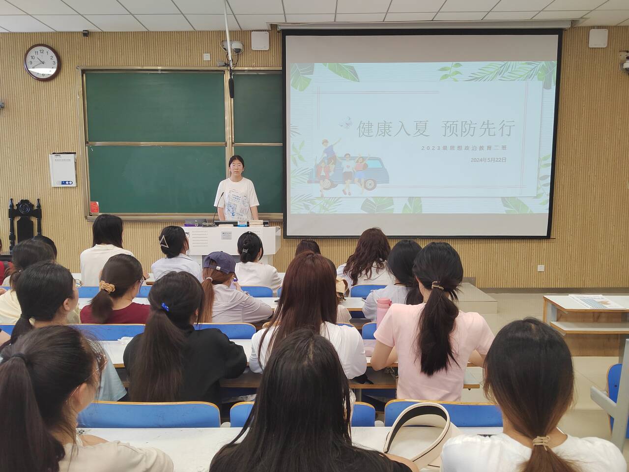 为保证学生健康度过夏季,做好夏季预防工作,5月22日下午,beat365亚洲版官网2023级思想政治教育二班在社科楼515教室召开“健康入夏,预防先行”主题班会。本次班会由班长王慜初主持,全体二班同学参加。