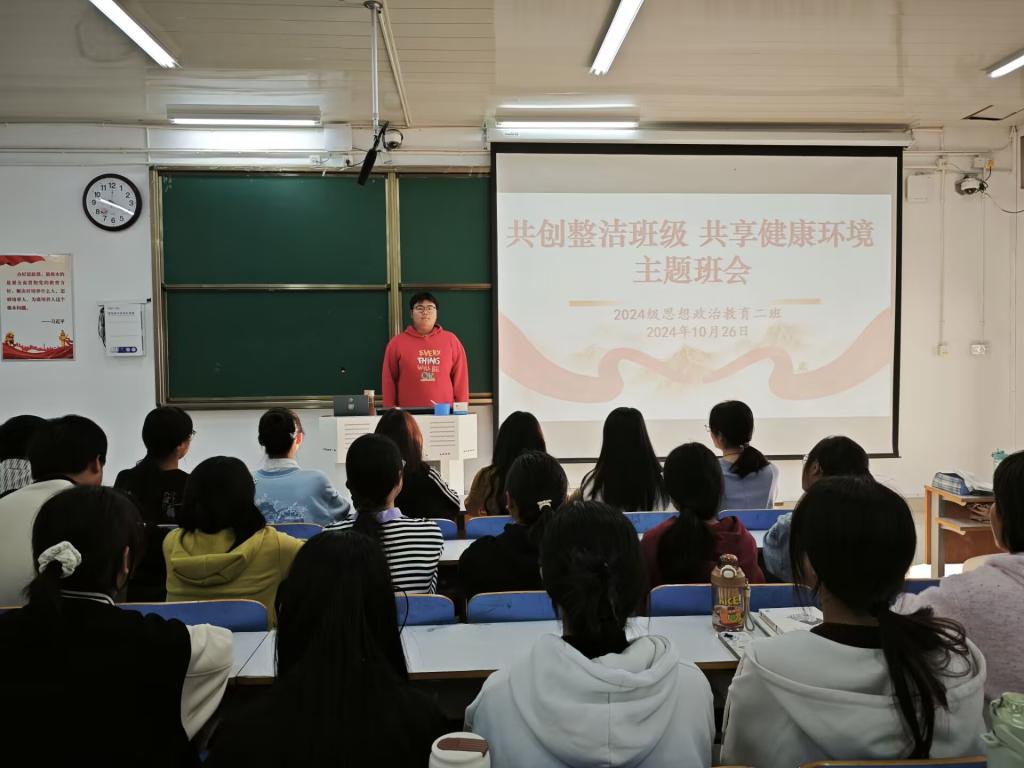 为积极营造整洁、健康的班级环境,提升同学们的环保意识和集体责任感,10 月26日,beat365亚洲版官网2024级思想政治教育二班于社科楼514教室开展了“共创整洁班级,共享健康环境”主题班会。本次班会由班长王志颖主持,二班全体同学共同参与。